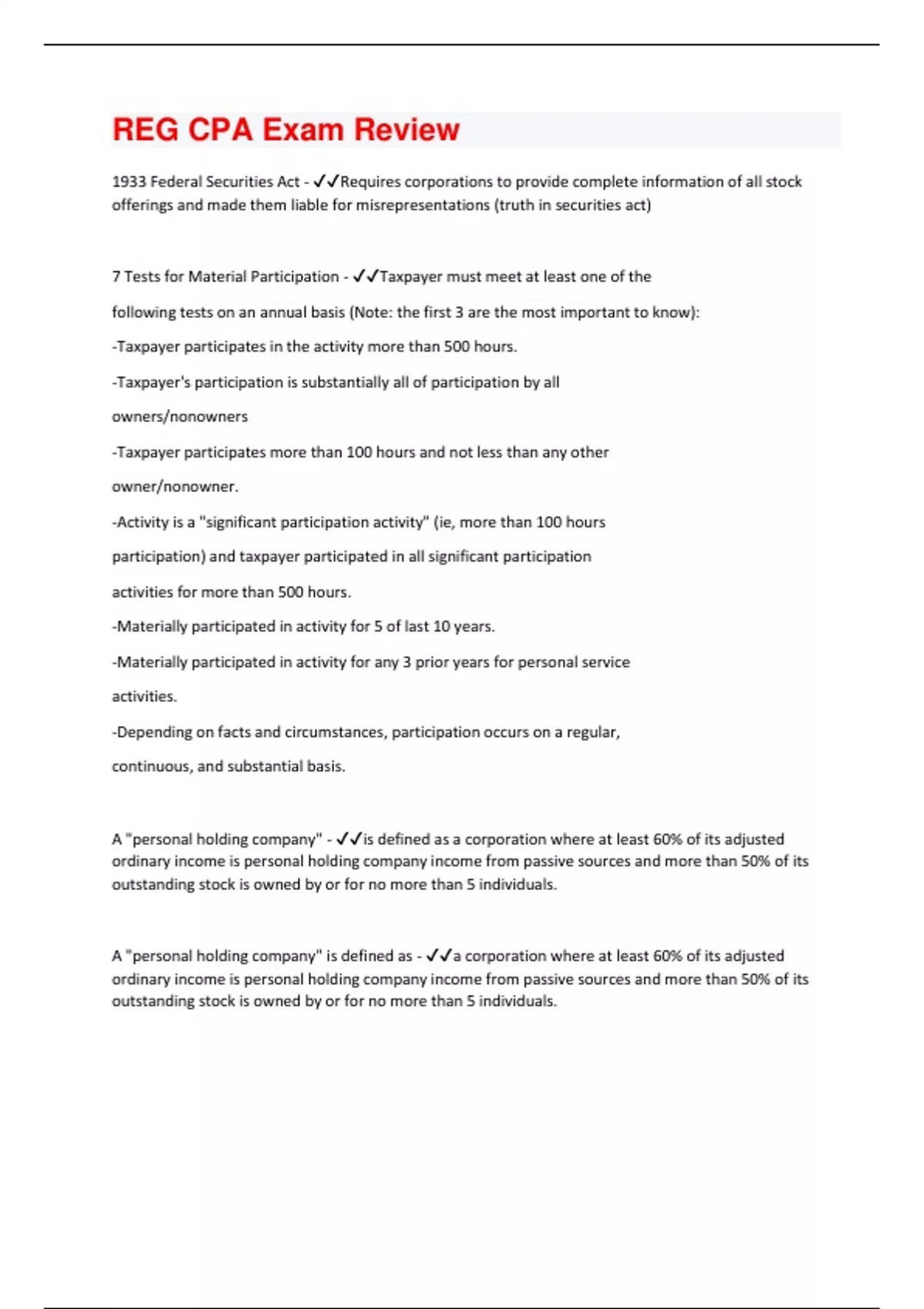 1933 Federal Securities Act - Requires corporations to provide complete information of all stock offerings and made them liable for misrepresentations (truth in securities act) 7 Tests for Material Participation - Taxpayer must meet at least one of the following tests on an annual basis (Note: the first 3 are the most important to know): -Taxpayer participates in the activity more than 500 hours. -Taxpayer's participation is substantially all of participation by all owners/nonowners -Taxpayer participates more than 100 hours and not less than any other owner/nonowner. -Activity is a "significant participation activity" (ie, more than 100 hours participation) and taxpayer participated in all significant participation activities for more than 500 hours. -Materially participated in activity for 5 of last 10 years. -Materially participated in activity for any 3 prior years for personal service activities. -Depending on facts and circumstances, participation occurs on a regular, continuous, and substantial basis.