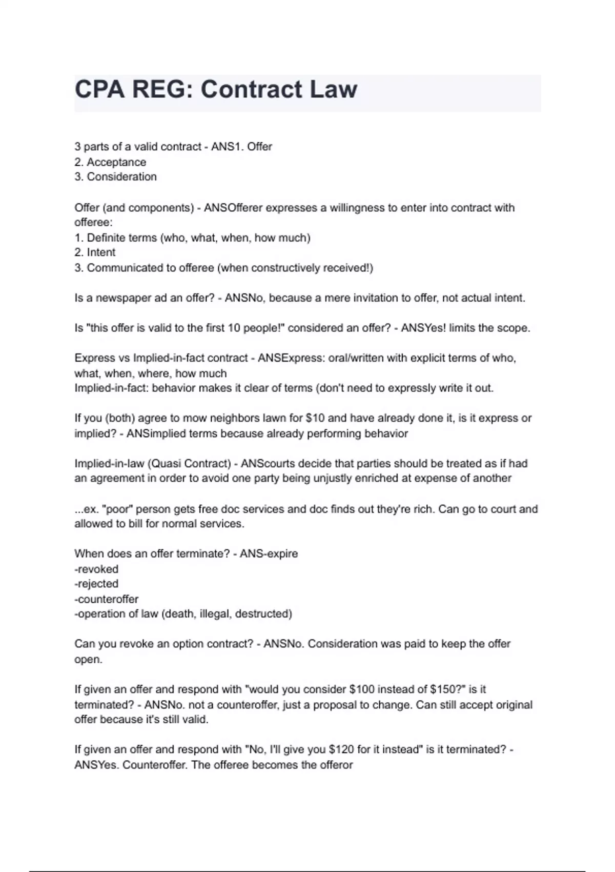 Bilateral vs unilateral contract - ANSbilateral: promise for a promise - can accept