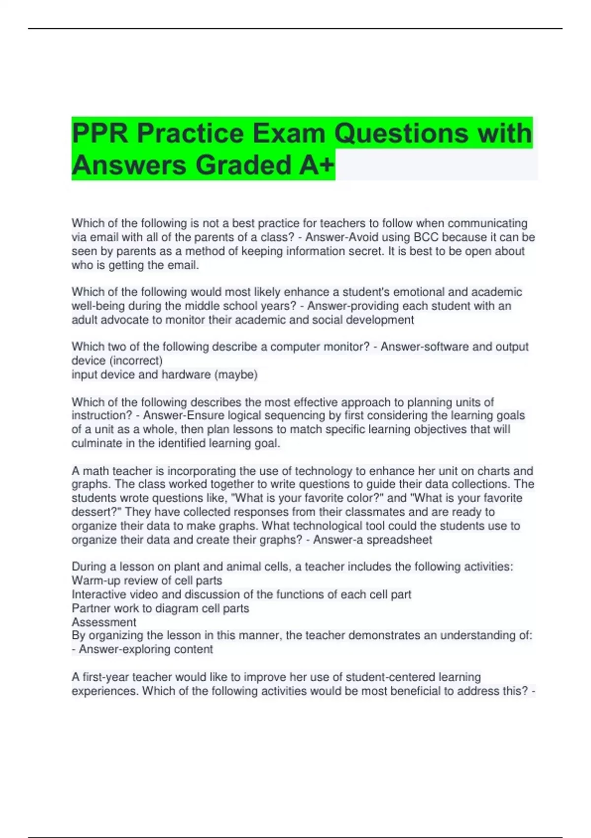 PPR Practice Exam Questions with Answers Graded A+ Which of the following is not a best practice for teachers to follow when communicating via email with all of the parents of a class? - Answer-Avoid using BCC because it can be seen by parents as a method of keeping information secret. It is best to be open about who is getting the email. Which of the following would most likely enhance a student's emotional and academic well-being during the middle school years? - Answer-providing each student with an adult advocate to monitor their academic and social development Which two of the following describe a computer monitor? - Answer-software and output device (incorrect) input device and hardware (maybe) Which of the following describes the most effective approach to planning units of instruction? - Answer-Ensure logical sequencing by first considering the learning goals of a unit as a whole, then plan lessons to match specific learning objectives that will culminate in the identified learning goal. A math teacher is incorporating the use of technology to enhance her unit on charts and graphs. The class worked together to write questions to guide their data collections. The students wrote questions like, "What is your favorite color?" and "What is your favorite dessert?" They have collected responses from their classmates and are ready to organize their data to make graphs. What technological tool could the students use to organize their data and create their graphs? - Answer-a spreadsheet During a lesson on plant and animal cells, a teacher includes the following activities: Warm-up review of cell parts Interactive video and discussion of the functions of each cell part Partner work to diagram cell parts Assessment By organizing the lesson in this manner, the teacher demonstrates an understanding of: - Answer-exploring content