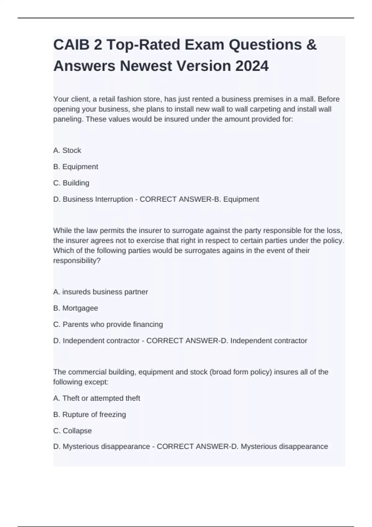 Your client, a retail fashion store, has just rented a business premises in a mall. Before opening your business, she plans to install new wall to wall carpeting and install wall paneling. These values would be insured under the amount provided for: A. Stock B. Equipment C. Building D. Business Interruption - CORRECT ANSWER-B. Equipment While the law permits the insurer to surrogate against the party responsible for the loss, the insurer agrees not to exercise that right in respect to certain parties under the policy. Which of the following parties would be surrogates agains in the event of their responsibility? A. insureds business partner B. Mortgagee C. Parents who provide financing D. Independent contractor - CORRECT ANSWER-D. Independent contractor The commercial building, equipment and stock (broad form policy) insures all of the following except: A. Theft or attempted theft B. Rupture of freezing C. Collapse D. Mysterious disappearance - CORRECT ANSWER-D. Mysterious disappearance