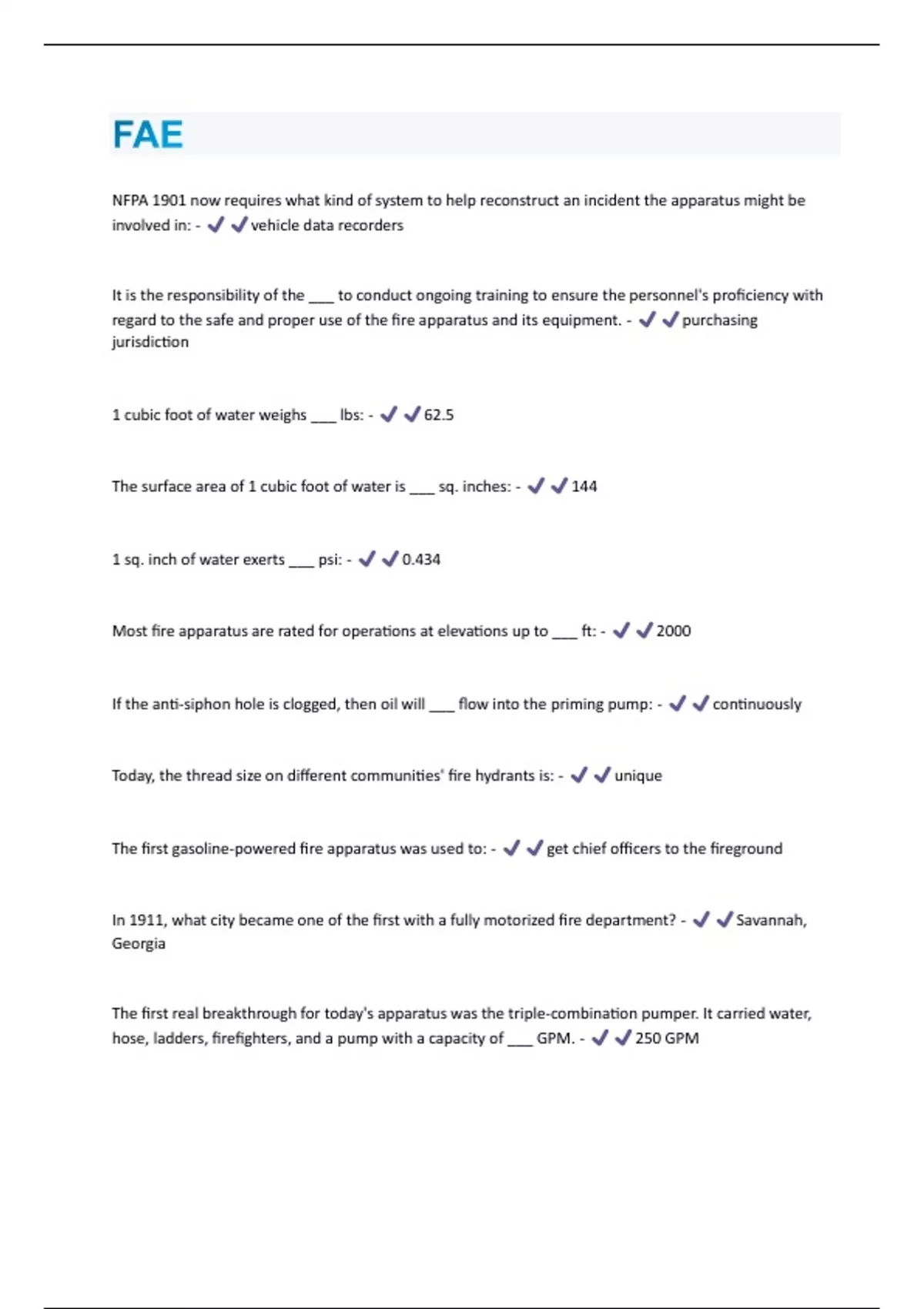 NFPA 1901 now requires what kind of system to help reconstruct an incident the apparatus might be involved in: - vehicle data recorders It is the responsibility of the ___ to conduct ongoing training to ensure the personnel's proficiency with regard to the safe and proper use of the fire apparatus and its equipment. - purchasing jurisdiction 1 cubic foot of water weighs ___ lbs: - 62.5 The surface area of 1 cubic foot of water is ___ sq. inches: - 144 1 sq. inch of water exerts ___ psi: - 0.434 Most fire apparatus are rated for operations at elevations up to ___ ft: - 2000 If the anti-siphon hole is clogged, then oil will ___ flow into the priming pump: - continuously Today, the thread size on different communities' fire hydrants is: - unique The first gasoline-powered fire apparatus was used to: - get chief officers to the fireground In 1911, what city became one of the first with a fully motorized fire department? - Savannah, Georgia The first real breakthrough for today's apparatus was the triple-combination pumper. It carried water, hose, ladders, firefighters, and a pump with a capacity of ___ GPM. - 250 GPMDue to the weight carried by modern fire apparatus, auxiliary brakes have been incorporated that aid braking by using what system to help slow it? - the engine's own systems to help slow it Anti-lock braking systems (ABS) uses sensors mounted on each wheel to: - control brake application in the event of a sudden or emergency stop In some parts of the country, before the empty fire buckets were filled with water, they were filled with ___ to be thrown on a fire. - sand One safety that is all too often underutilized by many crew members is: - seatbelts To be the driver of a pumper, a firefighter would need to be proficient in which NFPA 1002 chapter? - 4 NFPA 1451 Standard for Fire and Emergency Service Vehicle Operations Training Program requires drivers/operators to reauthorize how often? - annually If a mobile water supply apparatus is equipped with a fire pump, it must carry a minimum of _____ ft. of 2 1/2"+ hose must be available. - 200 5 functions of a quint: - 1) pump 2) water tank 3) fire hose storage 4) aerial 5) ground ladders Approximately what % of Earth's surface is covered by water? - 70-75%When water is moving, it has a combination of potential and ___ energy. - kinetic One advantage of a wet-barrel hydrant is: - you can add hose lines without shutting down the hydrant Red fire hydrant class and flow rate: - Class C and 0-499 GPM Orange fire hydrant class and flow rate: - Class B and 500-999 GPM Green fire hydrant class and flow rate: - Class A and GPM Blue fire hydrant class and flow rate: - Class AA and 1500+ GPM The first part of a fire hydrant inspection is to: - check the exterior of the hydrant for any damage Flow testing should be done at what time of the day? - at peak water flow times