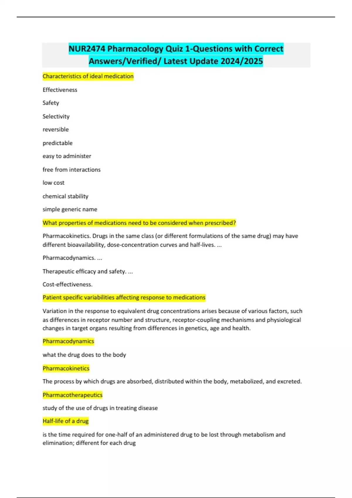 NUR2474 Pharmacology Quiz 1-Questions with Correct Answers/Verified/ Latest Update 2024/2025
