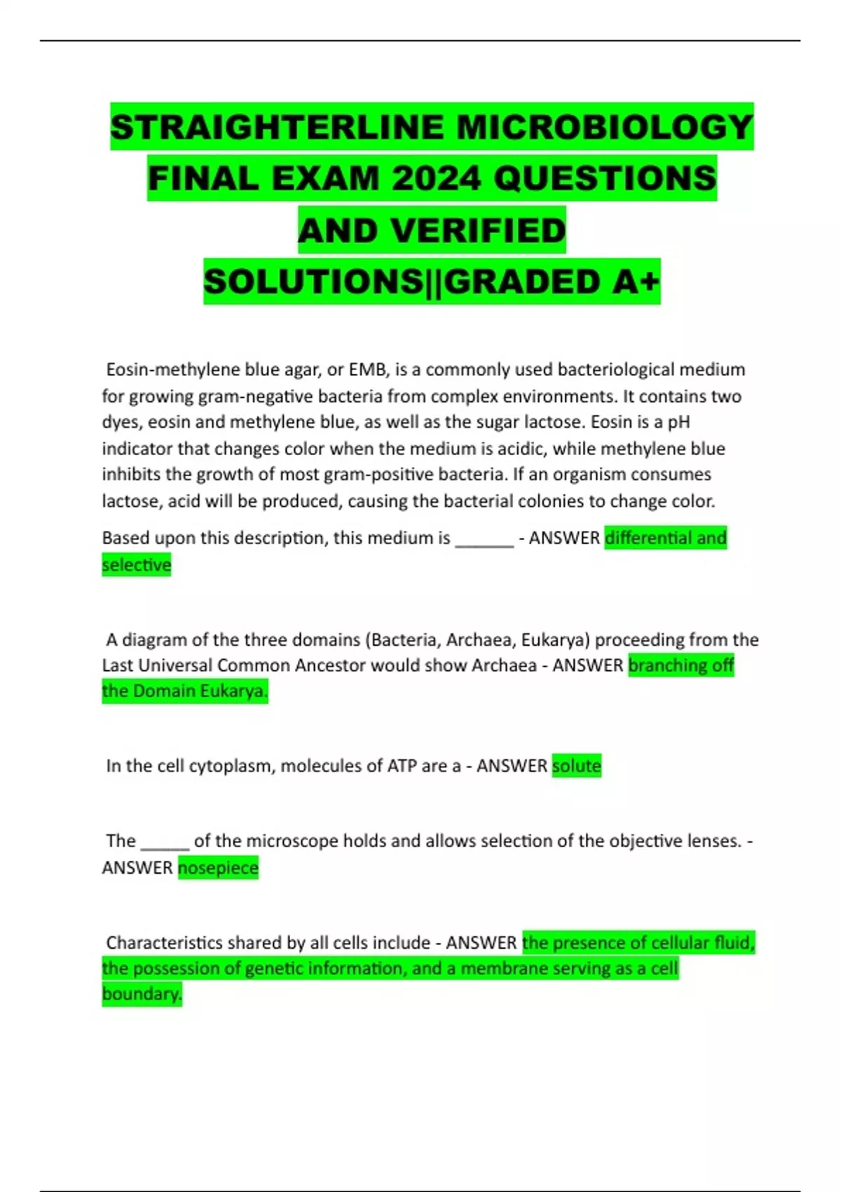 STRAIGHTERLINE MICROBIOLOGY FINAL EXAM 2024 QUESTIONS AND VERIFIED SOLUTIONS||GRADED A+