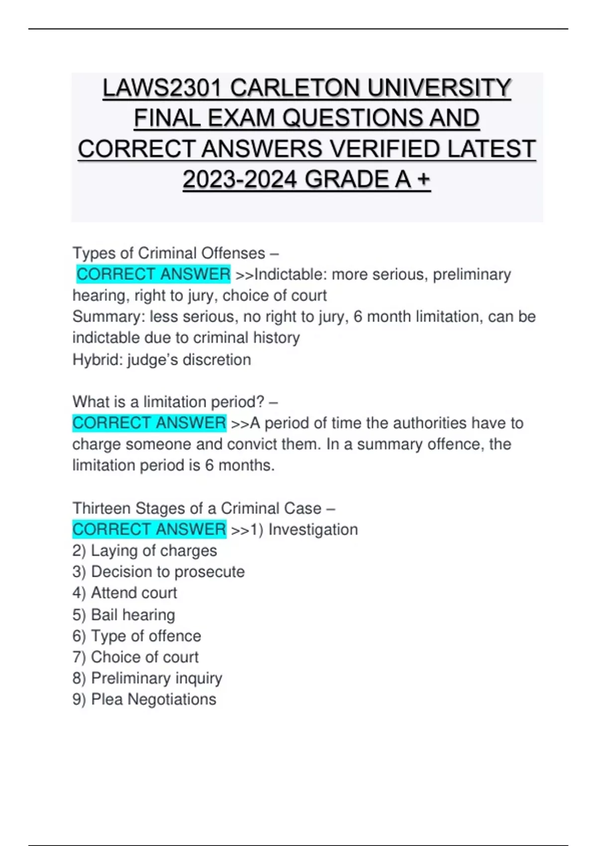 LAWS2301 CARLETON UNIVERSITY FINAL EXAM QUESTIONS AND CORRECT ANSWERS VERIFIED LATEST GRADE A + LAWS2301 CARLETON UNIVERSITY FINAL EXAM QUESTIONS AND CORRECT ANSWERS VERIFIED LATEST GRADE A +