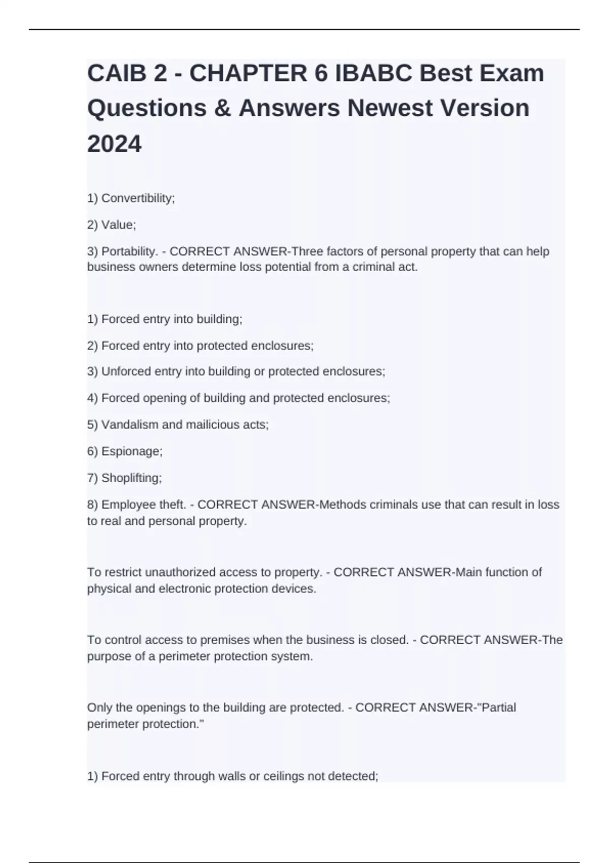 1) Convertibility; 2) Value; 3) Portability. - CORRECT ANSWER-Three factors of personal property that can help business owners determine loss potential from a criminal act. 1) Forced entry into building; 2) Forced entry into protected enclosures; 3) Unforced entry into building or protected enclosures; 4) Forced opening of building and protected enclosures; 5) Vandalism and mailicious acts; 6) Espionage; 7) Shoplifting; 8) Employee theft. - CORRECT ANSWER-Methods criminals use that can result in loss to real and personal property. To restrict unauthorized access to property. - CORRECT ANSWER-Main function of physical and electronic protection devices. To control access to premises when the business is closed. - CORRECT ANSWER-The purpose of a perimeter protection system. Only the openings to the building are protected. - CORRECT ANSWER-"Partial perimeter protection." 1) Forced entry through walls or ceilings not detected;