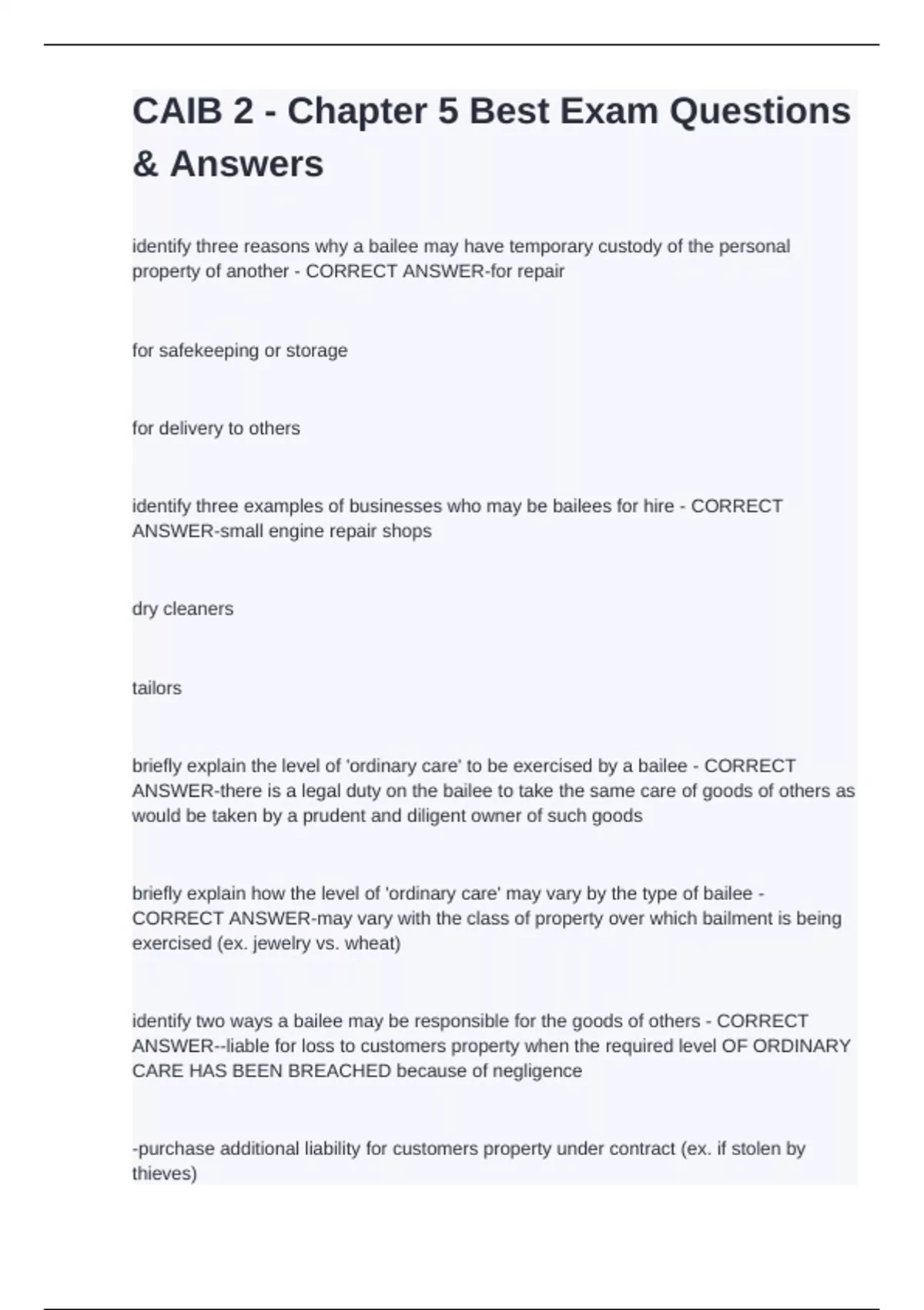 identify three reasons why a bailee may have temporary custody of the personal property of another - CORRECT ANSWER-for repair for safekeeping or storage for delivery to others identify three examples of businesses who may be bailees for hire - CORRECT ANSWER-small engine repair shops dry cleaners tailors briefly explain the level of 'ordinary care' to be exercised by a bailee - CORRECT ANSWER-there is a legal duty on the bailee to take the same care of goods of others as would be taken by a prudent and diligent owner of such goods briefly explain how the level of 'ordinary care' may vary by the type of bailee - CORRECT ANSWER-may vary with the class of property over which bailment is being exercised (ex. jewelry vs. wheat) identify two ways a bailee may be responsible for the goods of others - CORRECT ANSWER--liable for loss to customers property when the required level OF ORDINARY CARE HAS BEEN BREACHED because of negligence -purchase additional liability for customers property under contract (ex. if stolen by thieves)