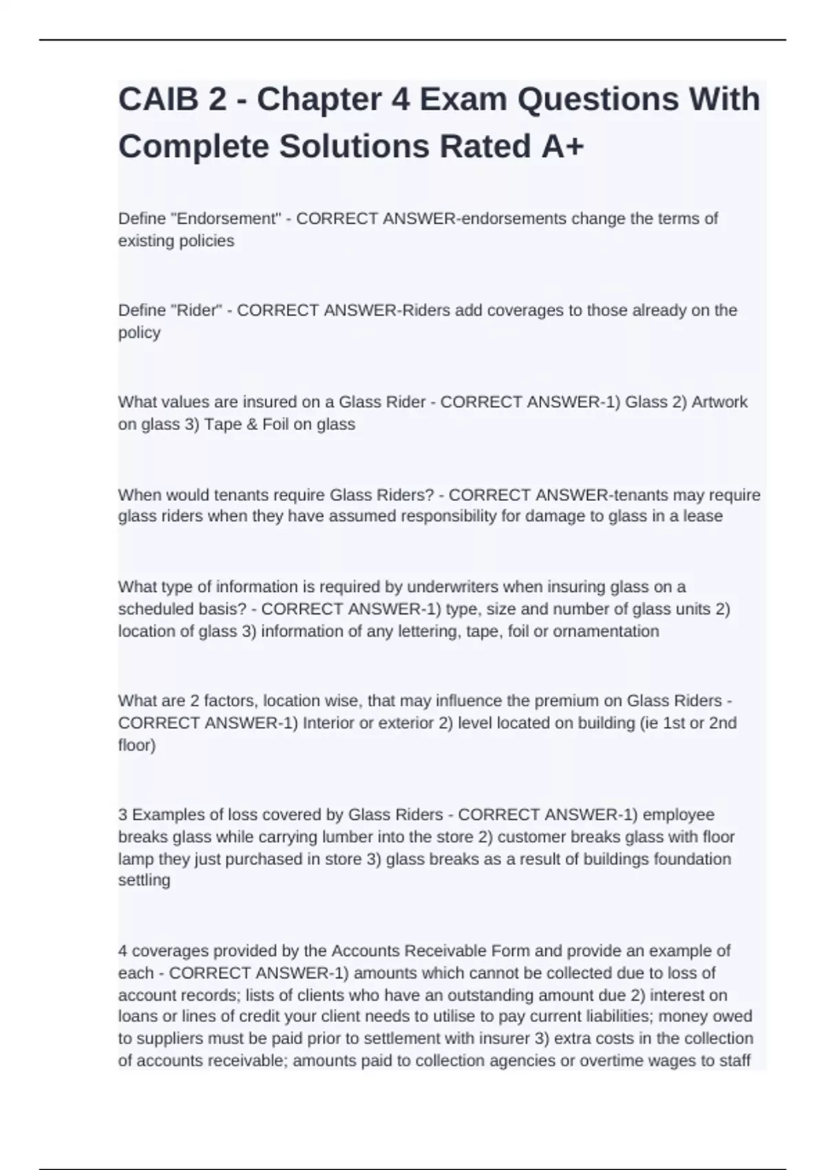 Define "Endorsement" - CORRECT ANSWER-endorsements change the terms of existing policies Define "Rider" - CORRECT ANSWER-Riders add coverages to those already on the policy What values are insured on a Glass Rider - CORRECT ANSWER-1) Glass 2) Artwork on glass 3) Tape & Foil on glass When would tenants require Glass Riders? - CORRECT ANSWER-tenants may require glass riders when they have assumed responsibility for damage to glass in a lease What type of information is required by underwriters when insuring glass on a scheduled basis? - CORRECT ANSWER-1) type, size and number of glass units 2) location of glass 3) information of any lettering, tape, foil or ornamentation What are 2 factors, location wise, that may influence the premium on Glass Riders - CORRECT ANSWER-1) Interior or exterior 2) level located on building (ie 1st or 2nd floor) 3 Examples of loss covered by Glass Riders - CORRECT ANSWER-1) employee breaks glass while carrying lumber into the store 2) customer breaks glass with floor lamp they just purchased in store 3) glass breaks as a result of buildings foundation settling 4 coverages provided by the Accounts Receivable Form and provide an example of each - CORRECT ANSWER-1) amounts which cannot be collected due to loss of account records; lists of clients who have an outstanding amount due 2) interest on loans or lines of credit your client needs to utilise to pay current liabilities; money owed to suppliers must be paid prior to settlement with insurer 3) extra costs in the collection of accounts receivable; amounts paid to collection agencies or overtime wages to staff trying to collect accounts 4) expenses incurred in the reconstruction of records; client hires accounting firm to reconstruct records