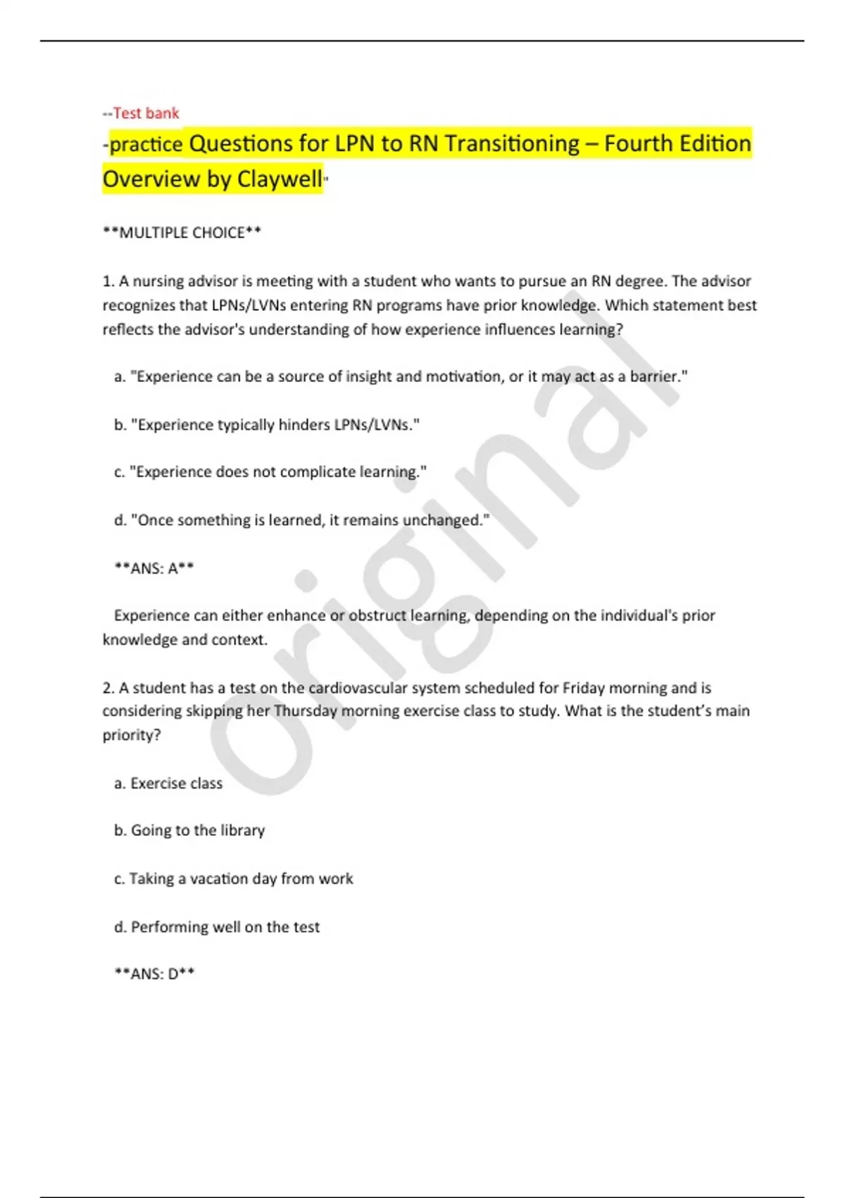 --Test bank -practice Questions for LPN to RN Transitioning – Fourth Edition Overview by Claywell" **MULTIPLE CHOICE** 1. A nursing advisor is meeting with a student who wants to pursue an RN degree. The advisor recognizes that LPNs/LVNs entering RN programs have prior knowledge. Which statement best reflects the advisor's understanding of how experience influences learning? a. "Experience can be a source of insight and motivation, or it may act as a barrier." b. "Experience typically hinders LPNs/LVNs." c. "Experience does not complicate learning." d. "Once something is learned, it remains unchanged." **ANS: A** Experience can either enhance or obstruct learning, depending on the individual's prior knowledge and context. 2. A student has a test on the cardiovascular system scheduled for Friday morning and is considering skipping her Thursday morning exercise class to study. What is the student’s main priority? a. Exercise class b. Going to the library c. Taking a vacation day from work d. Performing well on the test **ANS: D** The primary focus is on achieving a successful outcome in the test. 3. An LPN with ten years of experience is considering returning to school to become an RN. What statement reflects her primary motivation for this decision? a. "I need to schedule time for classes." b. "I need to budget for tuition." c. "I need to adjust my schedule." d. "There is a chance for advancement into administration." **ANS: D** The desire for career advancement drives the decision to pursue further education. 4. An RN is working with a diabetic patient who shows interest in improving her lifestyle by asking questions about diet. What stage of Lewin’s Change Theory is this patient in? a. Moving b. Unfreezing c. Action d. Refreezing **ANS: B** The patient is in the unfreezing stage, recognizing the need for change and preparing to take action. 5. An LPN discusses her intention to return to school with her clinical instructor. Based on her statements, what reflects her primary outcome priority? a. "My family wants me to go back to school." b. "I want to improve my financial situation." c. "I enjoy school." d. "I want to eventually move into a teaching role." **ANS: B** The priority is to address the need for better financial stability. 6. A nurse notices a management position she qualifies for. If she is in the moving phase of Lewin’s Change Theory, what action is she likely to take? a. Takes no action b. Applies for the position c. Recognizes the need for change d. Sticks with her current routine **ANS: B** In the moving phase, the nurse actively engages in planning and taking steps towards the change. 7. An orthopedic nurse is setting long-term goals. Which action reflects a long-term goal? a. Preparing for a telemetry exam next week b. Enrolling in a Nurse Practitioner program c. Attending a seminar to become a charge nurse d. Continuing full-time work on the orthopedic floor **ANS: B** Pursuing a Nurse Practitioner program represents a long-term goal, while the other actions are short-term. 8. An RN is discussing patient care improvement with the unit manager and learns about a "cohort." Which statement indicates an understanding of this concept? a. "A cohort is a network of connections." b. "A cohort is a group with shared experiences." c. "A cohort is a group united for common purposes." d. "A cohort is a collection of groups that form a whole." **ANS: B** A cohort is defined as a group of individuals who share common experiences. 9. During a lecture on experience and learning, which statement by an RN shows an effective understanding? a. "Experience always facilitates learning." b. "Experience can be a hindrance to new learning." c. "Experience is a pathway to new learning." d. "Experience may act as a diversion to learning." **ANS: B** Experience can sometimes act as a barrier to new learning due to conflicting information. 10. A lecture on experience and learning covers how experience affects learning. Which statement shows a clear understanding? a. "Experiences always enhance educational endeavors." b. "Unlearning is generally easier than initial learning." c. "Learning can be more challenging when previous knowledge is contradicted." d. "Experiences seldom benefit the learning process." **ANS: C** Learning can become more challenging if new information conflicts with previously held beliefs. **MULTIPLE RESPONSE** 1. Which of the following are examples of change processes? a. Coercive b. Collaborative c. Technocratic d. Planned e. Organized **ANS: A, C, D** Coercive, technocratic, and planned changes are recognized processes, whereas collaborative and organized are not typically classified as change processes. 2. Which comments reflect automatic thoughts according to holistic cognitive theory for stress reduction? a. "My lab instructor dislikes me; I had to redo my cardiac assessment." b. "After extensive studying, I finally remembered the steps to insert a Foley catheter. I will use this method again." c. "My child’s behavioral issues in preschool are because I am in school." d. "I knew there were answers I should have changed on my test; I must have failed." e. "Everything in my life is falling apart. I shouldn’t have started school." **ANS: A, C, D, E** Automatic thoughts are immediate, negative, and irrational, often including words like "should" and "never." 3. Which actions can improve personal empowerment skills? a. Practice positive self-talk. b. Manage success effectively. c. Develop an external locus of control. d. Eliminate self-defeating behaviors. e. Maintain good health. **ANS: A, B, D, E** Positive self-talk, effective management of success, eliminating self-defeating behaviors, and maintaining health all contribute to improved personal empowerment. 4. Which statements about stress reduction and coping mechanisms indicate effective learning? a. "Relaxation is a positive coping mechanism." b. "Catharsis is a form of stress reduction." c. "Reframing helps 