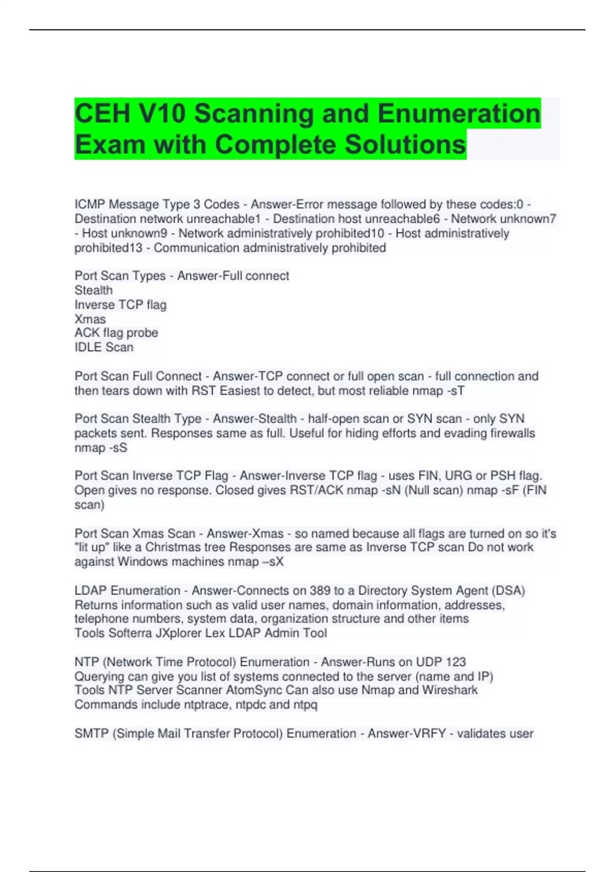 CEH V10 Scanning and Enumeration Exam with Complete Solutions ICMP Message Type 3 Codes - Answer-Error message followed by these codes:0 - Destination network unreachable1 - Destination host unreachable6 - Network unknown7 - Host unknown9 - Network administratively prohibited10 - Host administratively prohibited13 - Communication administratively prohibited Port Scan Types - Answer-Full connect Stealth Inverse TCP flag Xmas ACK flag probe IDLE Scan Port Scan Full Connect - Answer-TCP connect or full open scan - full connection and then tears down with RST Easiest to detect, but most reliable nmap -sT Port Scan Stealth Type - Answer-Stealth - half-open scan or SYN scan - only SYN packets sent. Responses same as full. Useful for hiding efforts and evading firewalls nmap -sS Port Scan Inverse TCP Flag - Answer-Inverse TCP flag - uses FIN, URG or PSH flag. Open gives no response. Closed gives RST/ACK nmap -sN (Null scan) nmap -sF (FIN scan) Port Scan Xmas Scan - Answer-Xmas - so named because all flags are turned on so it's "lit up" like a Christmas tree Responses are same as Inverse TCP scan Do not work against Windows machines nmap –sX LDAP Enumeration - Answer-Connects on 389 to a Directory System Agent (DSA) Returns information such as valid user names, domain information, addresses, telephone numbers, system data, organization structure and other items Tools Softerra JXplorer Lex LDAP Admin Tool NTP (Network Time Protocol) Enumeration - Answer-Runs on UDP 123 Querying can give you list of systems connected to the server (name and IP) Tools NTP Server Scanner AtomSync Can also use Nmap and Wireshark Commands include ntptrace, ntpdc and ntpq