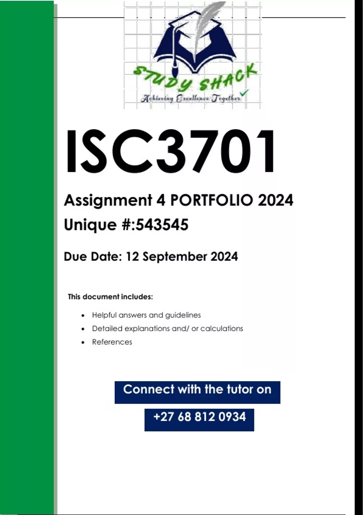 This document contains workings, explanations and solutions to the ISC3701 Assignment 4 (PORTFOLIO QUALITY ANSWERS) 2024. For assistance whats-app us on 0.6.8..8.1.2..0.9.3.4... This section requires the students to demonstrate basic skills such as organising the work by including the table of content; some of the skills are required for future teachers. This section will also assist the reader/marker in understanding your readiness and competence to be a teacher. 1.A cover page (neat and well-designed). 2.A table of contents (TOC) (2) 3.A short biography to introduce yourself to the reader (max 100 words).(3) 4. A teaching statement describing your teaching beliefs, practices, and theories (300 words).(10) A.MARKED ASSIGNMENTS 1.1 Write your reflections on the 2024 marked assignments, discussions, and interactions between you as the student & the module lecturer. Describe your overall experience of online learning and the ISC3701 module. There must be evidence of reflection and growth in the Portfolio. These reflections also mean looking at your entire practice as a teacher. This is very important if you are to develop holistically. (15) 3 1.2 Write a set of five questions you would suggest teachers can ask themselves to reflect on their designed or planned lesson. Your answer should contain or include the following views: (5) (5) After they have prepared the lesson (before they teach it)While they are teaching the lesson (during their presentation)After they have taught the lesson (5) B.DESIGNING, PRESENTING, AND REFLECTING ON THE LESSON PLAN 2.1 After you have designed your lesson; you might even have presented it as part of your practicals/teaching practice. What do you think about the lesson you have designed and presented? Were you satisfied with the feedback from the assessor/supervisor? (5) 2.2 Now, imagine you were to present that planned lesson in an online learning environment. Describe how you would support your learners during their online learning experience to ensure their satisfaction and success. For this exercise, •Identify and describe the specific module/subject and student profile. (10)•Reflect on the use of educational technology and identify the different teaching theories (at least two) that would inform your decisions in selecting the educational technology to support your students. (15)•Explain how the teaching or educational theories will assist you in supporting your students in online learning. (15) C.STUDENT SUPPORT In conclusion, take a moment to reflect on these questions: (10) •Briefly describe the support you received from the lecturer and other students. •What challenges did you experience during the 2023 academic year for this module? •What do you think the lecturer should do to improve student support for this module? •Which specific aspects that you were struggling with as a student teacher have been addressedby the lecturer during this academic year?