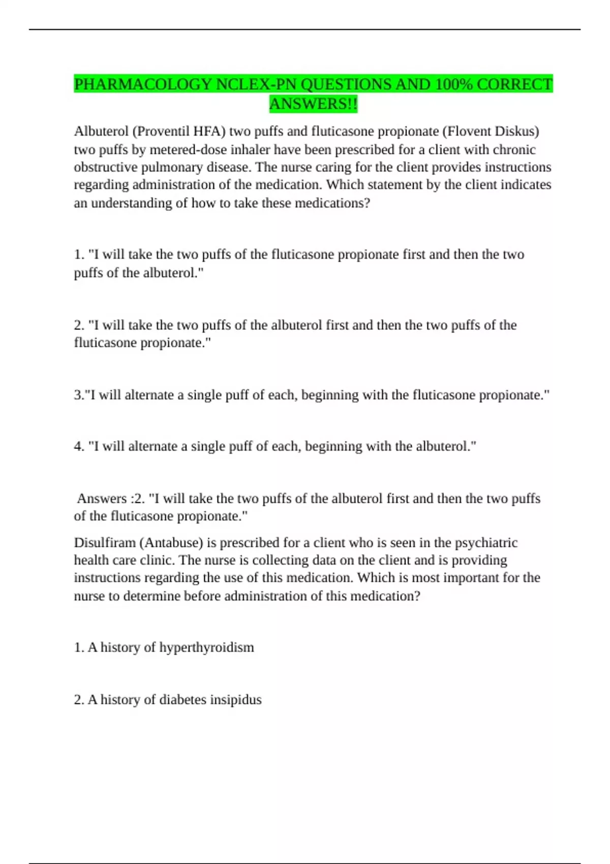 PHARMACOLOGY NCLEX-PN QUESTIONS AND 100% CORRECT
