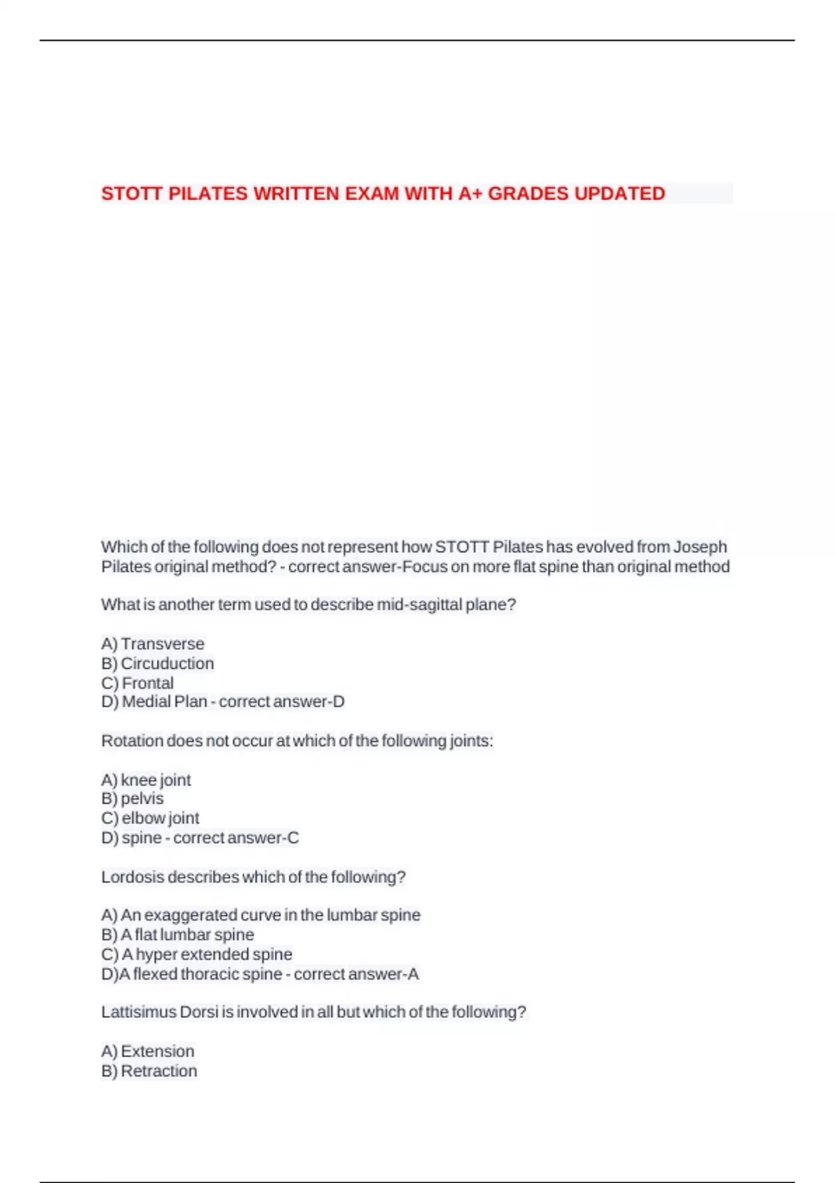 STOTT PILATES WRITTEN EXAM WITH A+ GRADES UPDATED