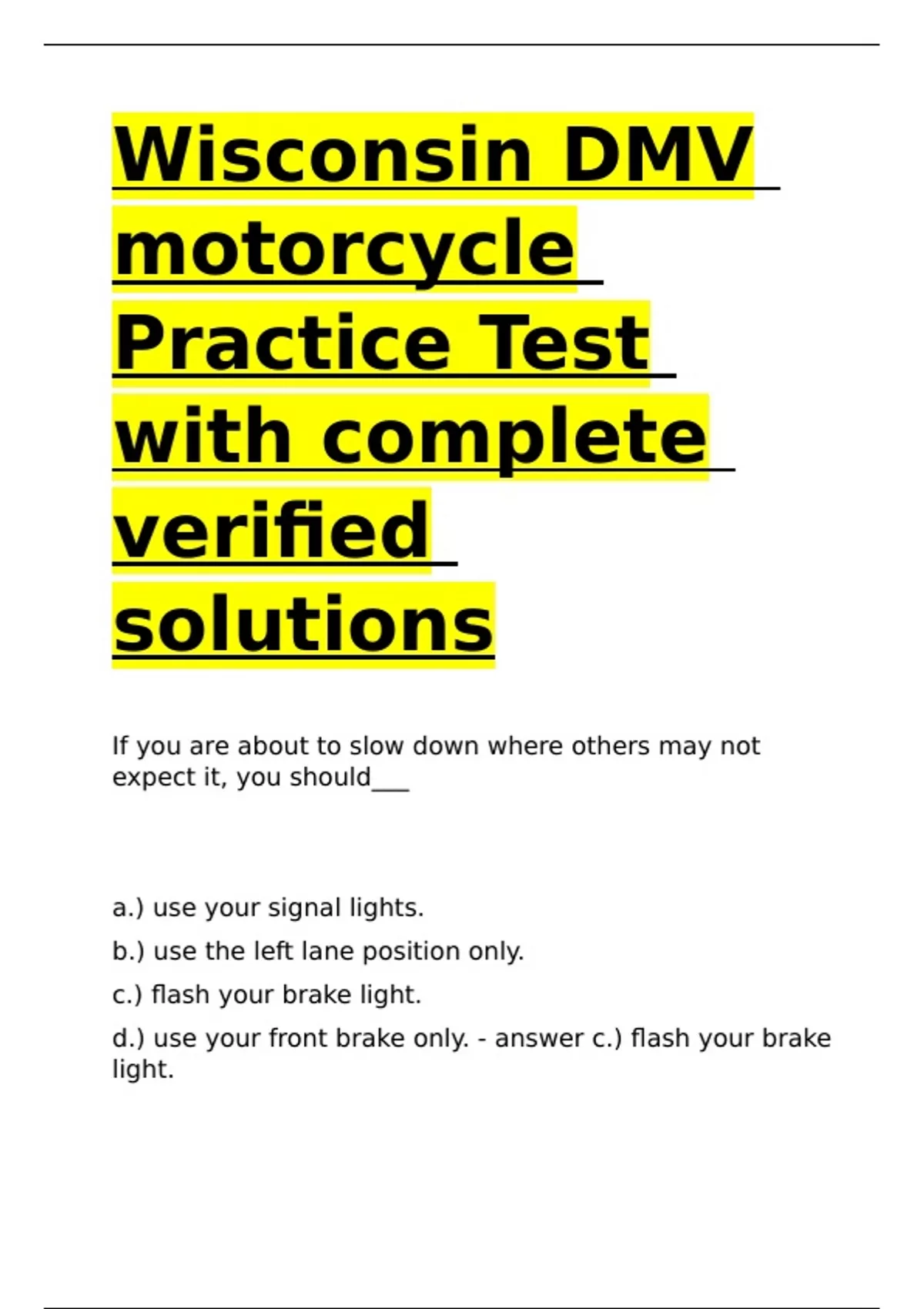 Wisconsin DMV motorcycle Practice Test with complete verified solutions