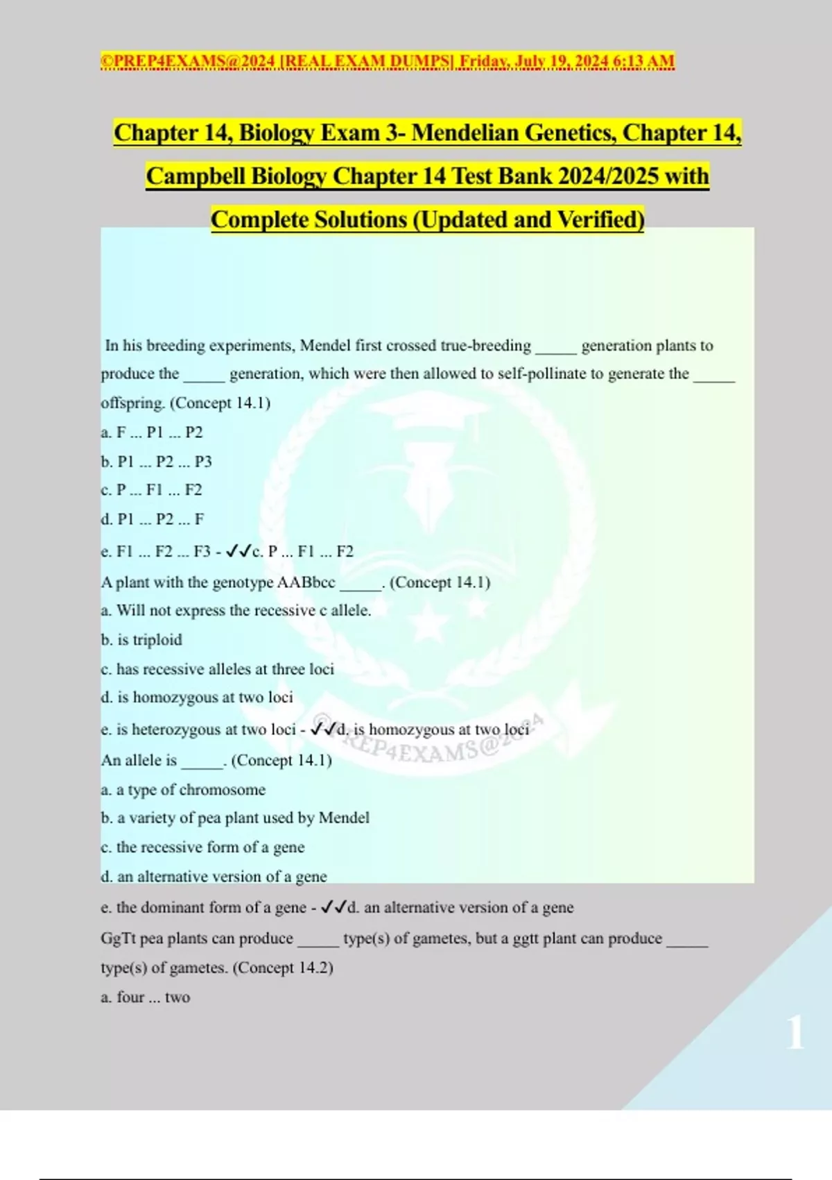 Campbell Biology Chapter 14 Test Bank 2024/2025 with