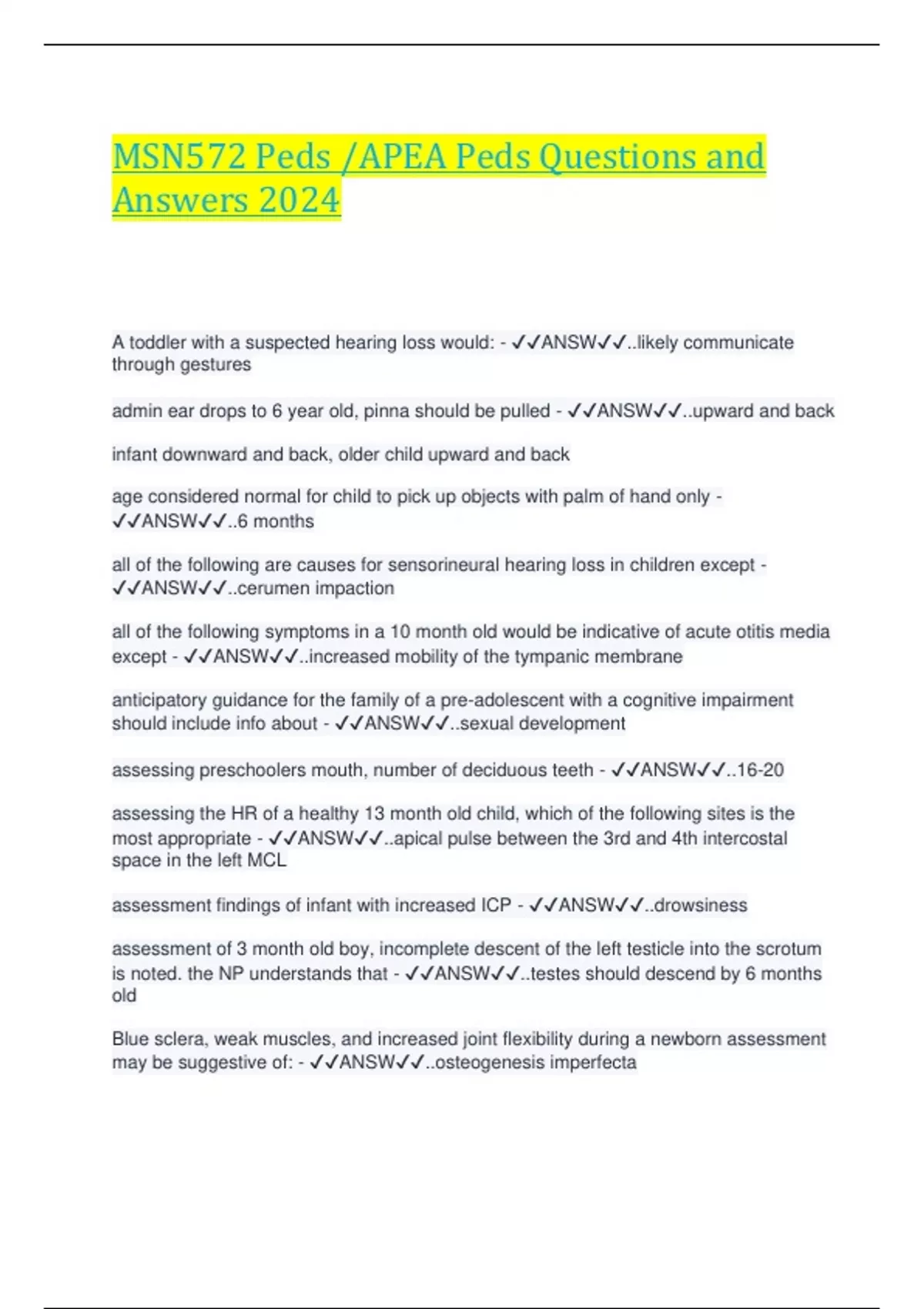 MSN572 Peds /APEA Peds Questions and Answers 2024