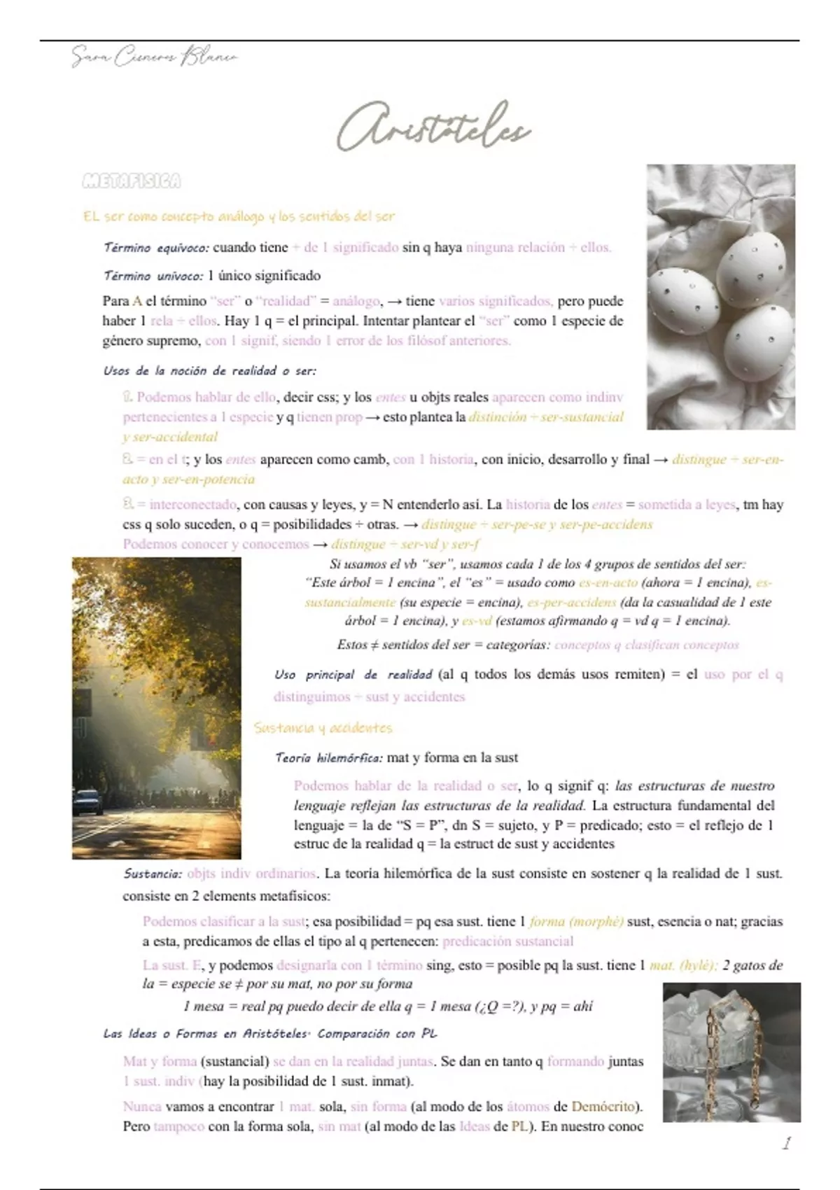 Sustancia: objts indiv ordinarios. La teoría hilemórfica de la sust consiste en sostener q la realidad de 1 sust.