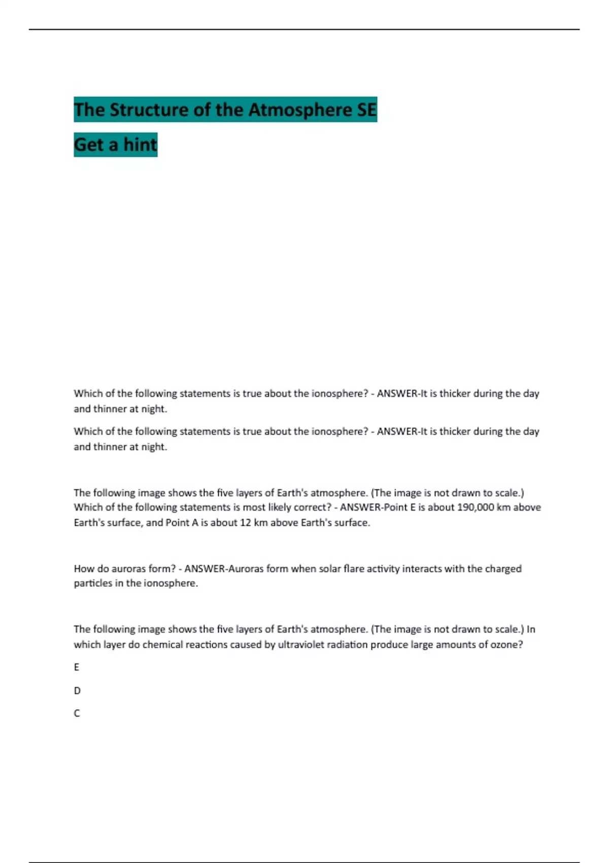Approximately what is the thickness of the ionosphere? - ANSWER-from 50 to 1,000 km above the
