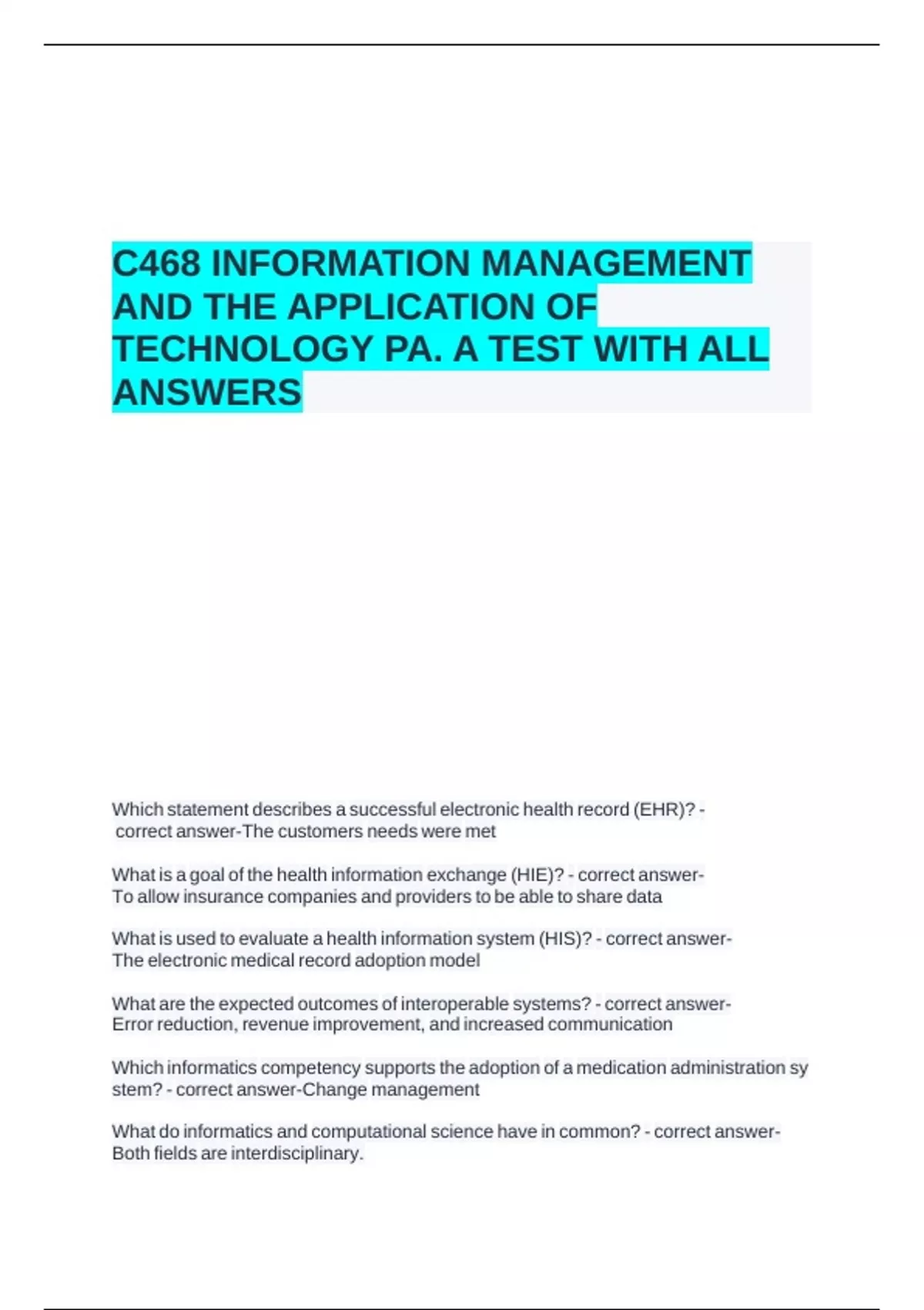 C468 INFORMATION MANAGEMENT AND THE APPLICATION OF TECHNOLOGY PA. A TEST WITH ALL ANSWERS