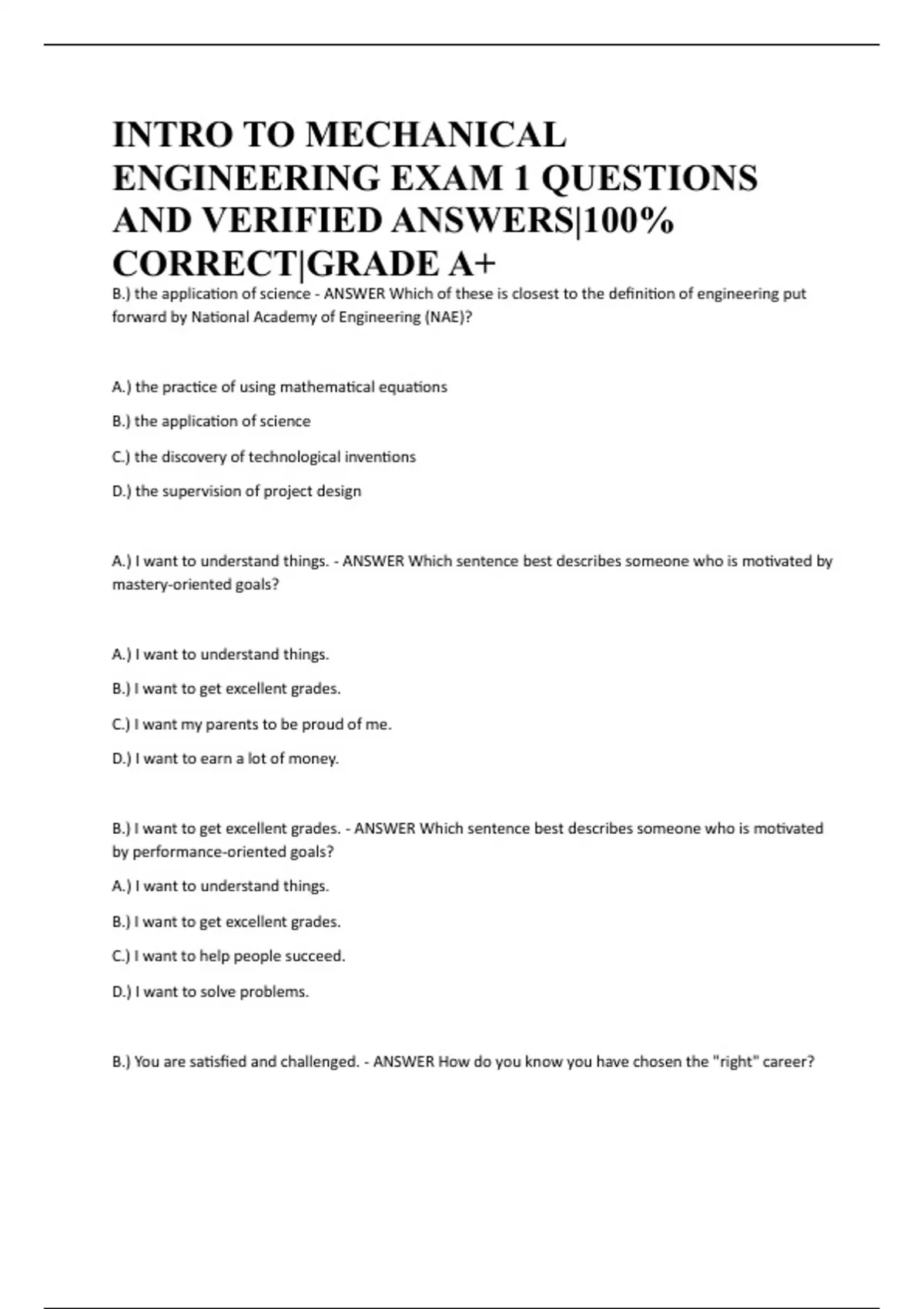 INTRO TO MECHANICAL ENGINEERING EXAM 1 QUESTIONS AND VERIFIED ANSWERS|100% CORRECT|GRADE A+