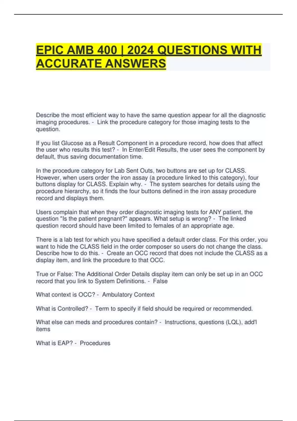 EPIC AMB 400 | 2024 QUESTIONS WITH ACCURATE ANSWERS Describe the most efficient way to have the same question appear for all the diagnostic imaging procedures. - Link the procedure category for those imaging tests to the question. If you list Glucose as a Result Component in a procedure record, how does that affect the user who results this test? - In Enter/Edit Results, the user sees the component by default, thus saving documentation time. In the procedure category for Lab Sent Outs, two buttons are set up for CLASS. However, when users order the iron assay (a procedure linked to this category), four buttons display for CLASS. Explain why. - The system searches for details using the procedure hierarchy, so it finds the four buttons defined in the iron assay procedure record and displays them. Users complain that when they order diagnostic imaging tests for ANY patient, the question "Is the patient pregnant?" appears. What setup is wrong? - The linked question record should have been limited to females of an appropriate age. There is a lab test for which you have specified a default order class. For this order, you want to hide the CLASS field in the order composer so users do not change the class. Describe how to do this. - Create an OCC record that does not include the CLASS as a display item, and link the procedure to that OCC.