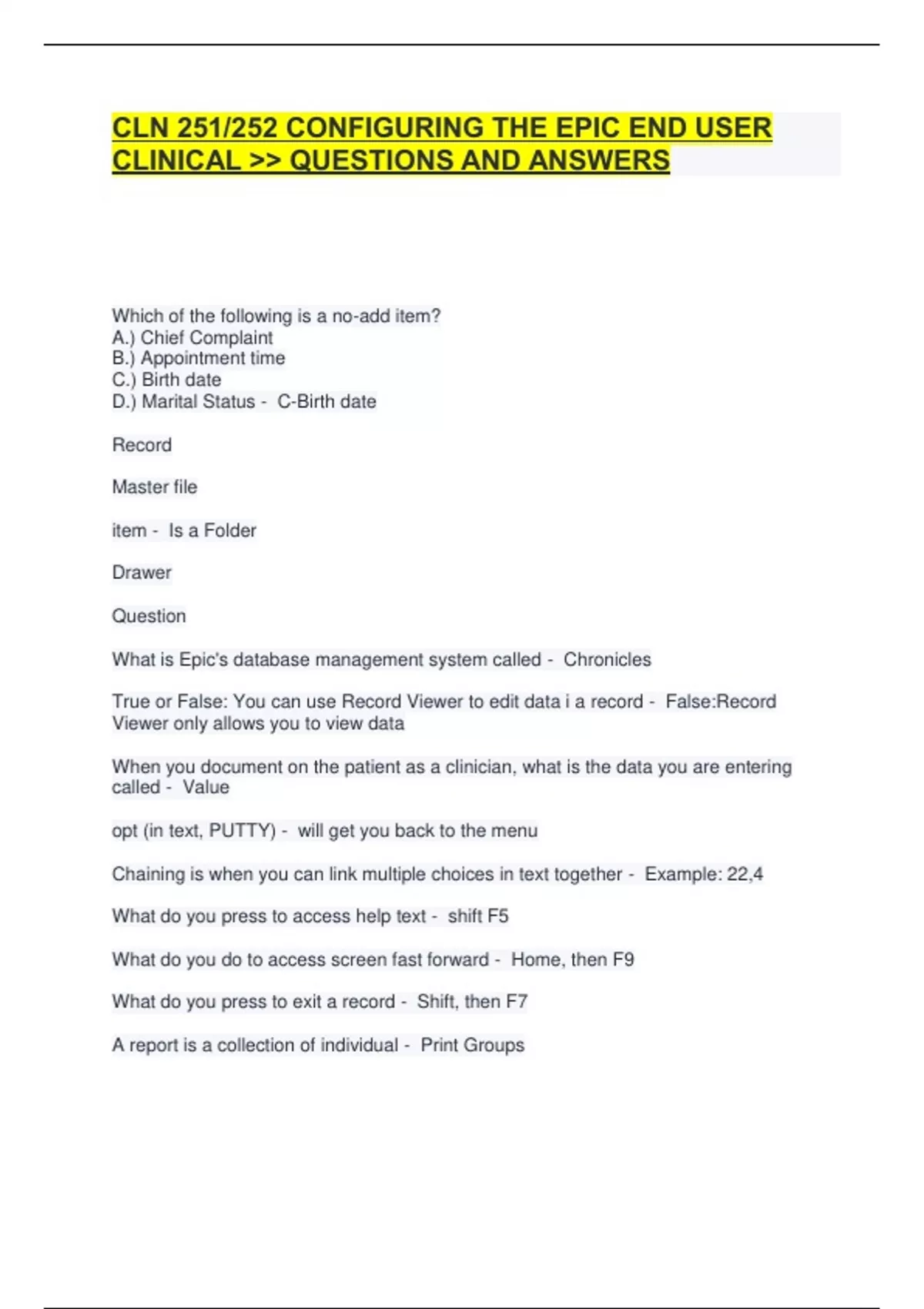 CLN 251/252 CONFIGURING THE EPIC END USER CLINICAL >> QUESTIONS AND ANSWERS Which of the following is a no-add item? A.) Chief Complaint B.) Appointment time C.) Birth date D.) Marital Status - C-Birth date Record Master file item - Is a Folder Drawer Question What is Epic's database management system called - Chronicles True or False: You can use Record Viewer to edit data i a record - False:Record Viewer only allows you to view data When you document on the patient as a clinician, what is the data you are entering called - Value opt (in text, PUTTY) - will get you back to the menu Chaining is when you can link multiple choices in text together - Example: 22,4 What do you press to access help text - shift F5 What do you do to access screen fast forward - Home, then F9 What do you press to exit a record - Shift, then F7 A report is a collection of individual - Print Groups Where can you look up and see a preview of Epic-released print groups? - Epic Data handbook What activity should an end user use to view the names and ID numbers of print goups in Hyperspace - Session Information report Facility Structure - General to Specific Facility>Service Area>Location>Department>Room>Bed True or False: Hovering over a section name in the table of contents and clicking the arrow next to it opens the section in edit mode - False-Using the arrow opens the section in read-only mode to more easily review information previously documented on the patient. Navigators allow you to a.) Review information b.) Document information c.) Access other activities d.) All of the above - All of the above Dr. Scan does not have an Imaging tab in the Chart Review activity and requests this tab be added. To modify the Chart Review tabs that appear for Dr. Scan, an administrator would change what type of record (Profile, User, Security, or Role) - Profile Record When Dr. Hart writes notes in Hyperspace, her name should appear as the author followed by the letters "MD". What record(s) is/are necessary for her to be able to log in to Hyperspace and for her name and credentials to appear on notes? (Provider, User, or Both) - Both provider & user Nurse Denver and Nurse Apple work in the Emergency Department. Both have access to the same activities. When Nurse Denver logs in, the first screen she sees is the ED Manager, while Nurse Apple's first screen is the ED Track Board. This is because they have different... ( Security Classes, Roles, or Profiles) - Roles Dr. Cloud is a new physician who will be seeing patients in a clinic and a hospital. Which types of security will Dr. Cloud need to have access to the proper functionality for his work? Could be multiple answers. (EpicCare, Reporting Workbench, In Basket, Shared, & Inpatient) - All of them EpicCare, Reporting Workbench, In Basket, Shared, & Inpatient security class - access role - layout