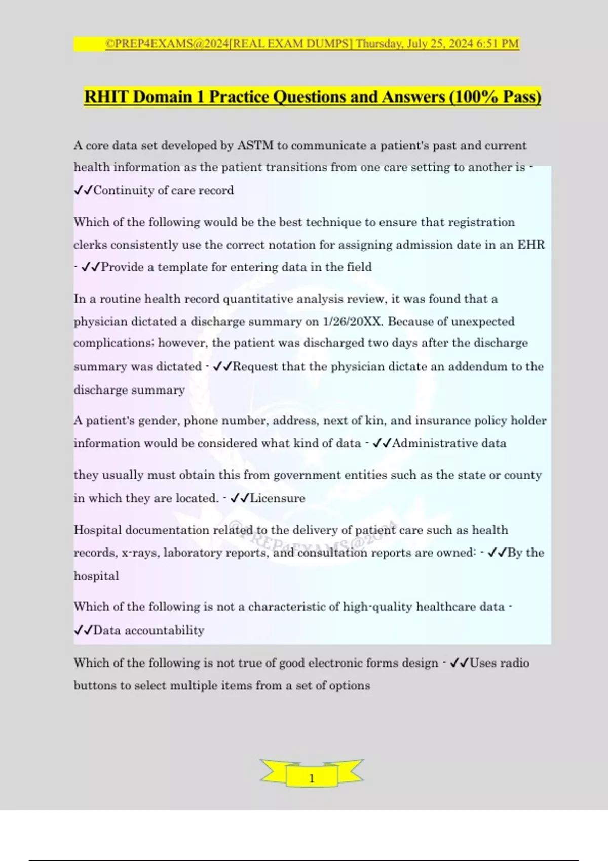 RHIT Domain 1 Practice Questions and Answers (100% Pass)