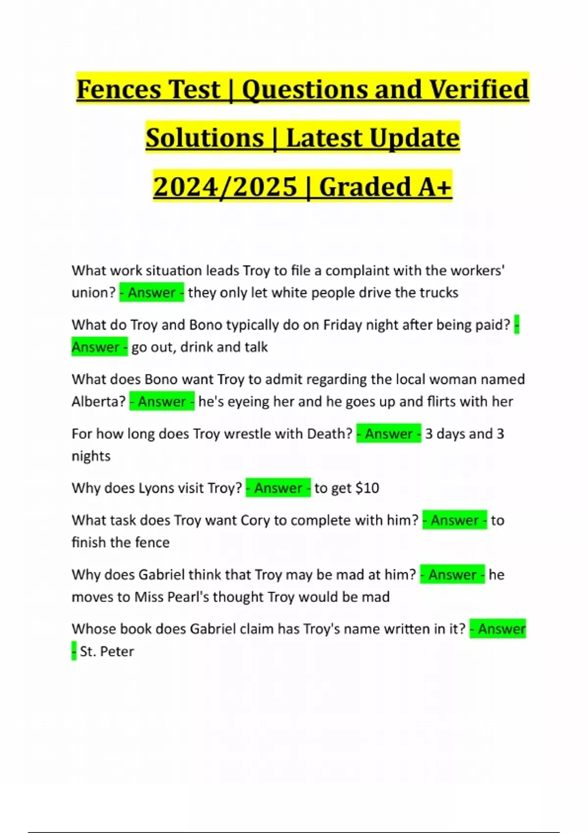 Fences Test | Questions and Verified Solutions | Latest Update 2024/2025 | Graded A+ What work situation leads Troy to file a complaint with the workers' union? - Answer - they only let white people drive the trucks What do Troy and Bono typically do on Friday night after being paid? - Answer - go out, drink and talk What does Bono want Troy to admit regarding the local woman named Alberta? - Answer - he's eyeing her and he goes up and flirts with her For how long does Troy wrestle with Death? - Answer - 3 days and 3 nights Why does Lyons visit Troy? - Answer - to get $10 What task does Troy want Cory to complete with him? - Answer - to finish the fence Why does Gabriel think that Troy may be mad at him? - Answer - he moves to Miss Pearl's thought Troy would be mad Whose book does Gabriel claim has Troy's name written in it? - Answer - St. PeterWhat caused Gabriel's head injury? - Answer - he got shot in the head during the war