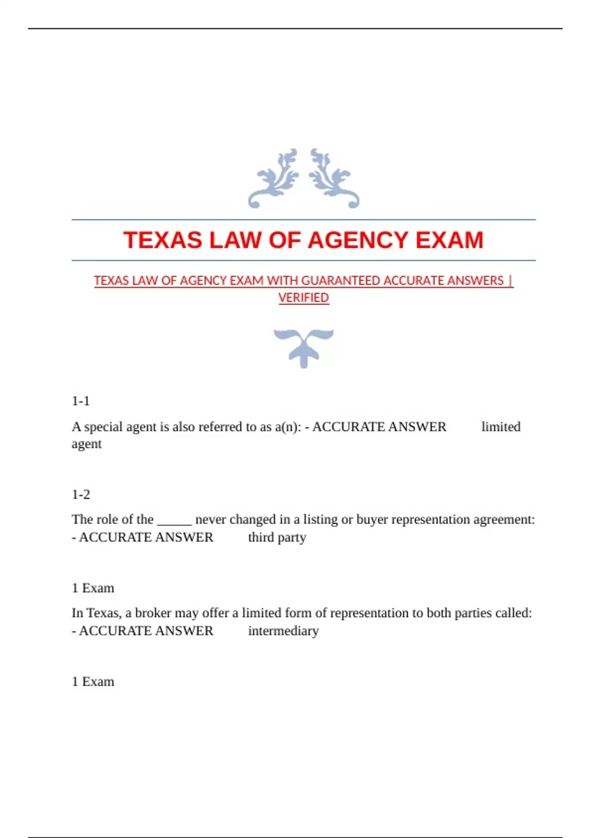 TEXAS LAW OF AGENCY EXAM WITH GUARANTEED ACCURATE ANSWERS |
