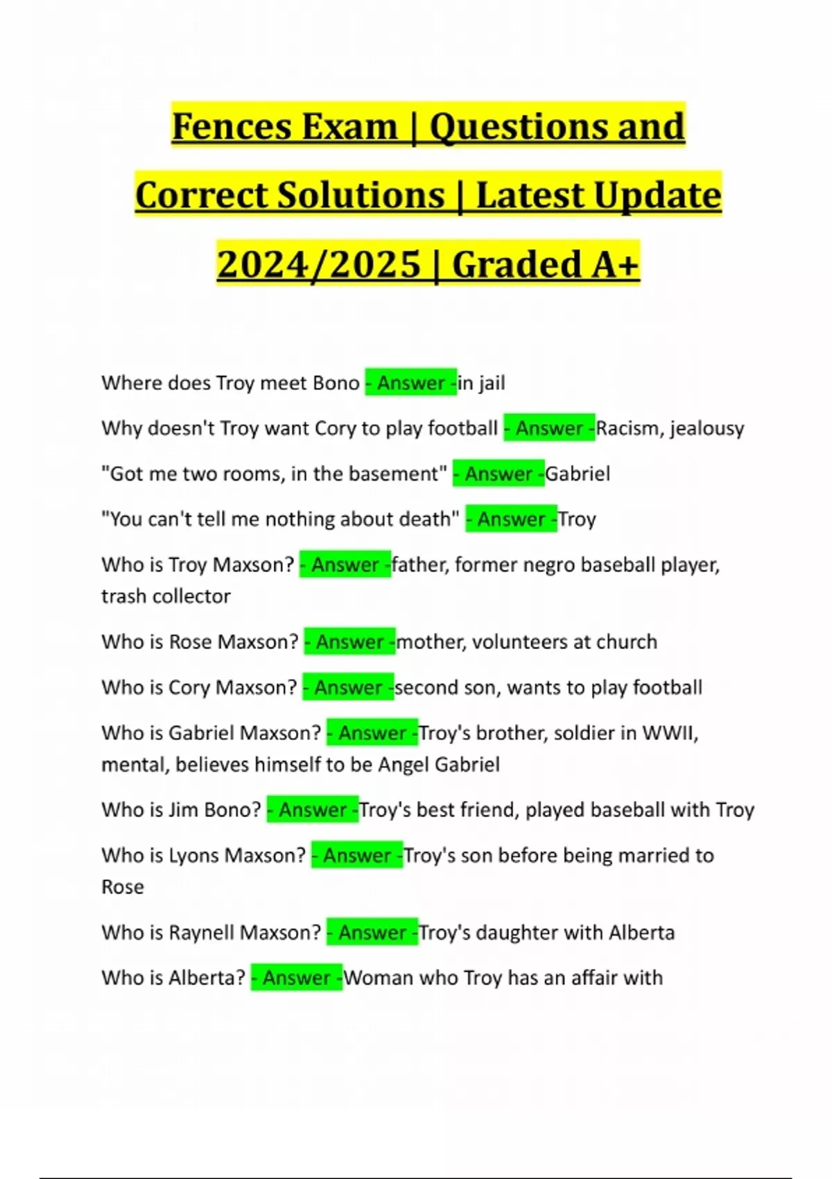 Fences Exam | Questions and Correct Solutions | Latest Update 2024/2025 | Graded A+ Where does Troy meet Bono - Answer -in jail Why doesn't Troy want Cory to play football - Answer -Racism, jealousy "Got me two rooms, in the basement" - Answer -Gabriel "You can't tell me nothing about death" - Answer -Troy Who is Troy Maxson? - Answer -father, former negro baseball player, trash collector Who is Rose Maxson? - Answer -mother, volunteers at church Who is Cory Maxson? - Answer -second son, wants to play football Who is Gabriel Maxson? - Answer -Troy's brother, soldier in WWII, mental, believes himself to be Angel Gabriel Who is Jim Bono? - Answer -Troy's best friend, played baseball with Troy Who is Lyons Maxson? - Answer -Troy's son before being married to Rose Who is Raynell Maxson? - Answer -Troy's daughter with Alberta Who is Alberta? - Answer -Woman who Troy has an affair withWho is Mr. Rand? - Answer -Troy and Bono's Boss Why does Rose want the fence to be built - Answer -To hold in her love