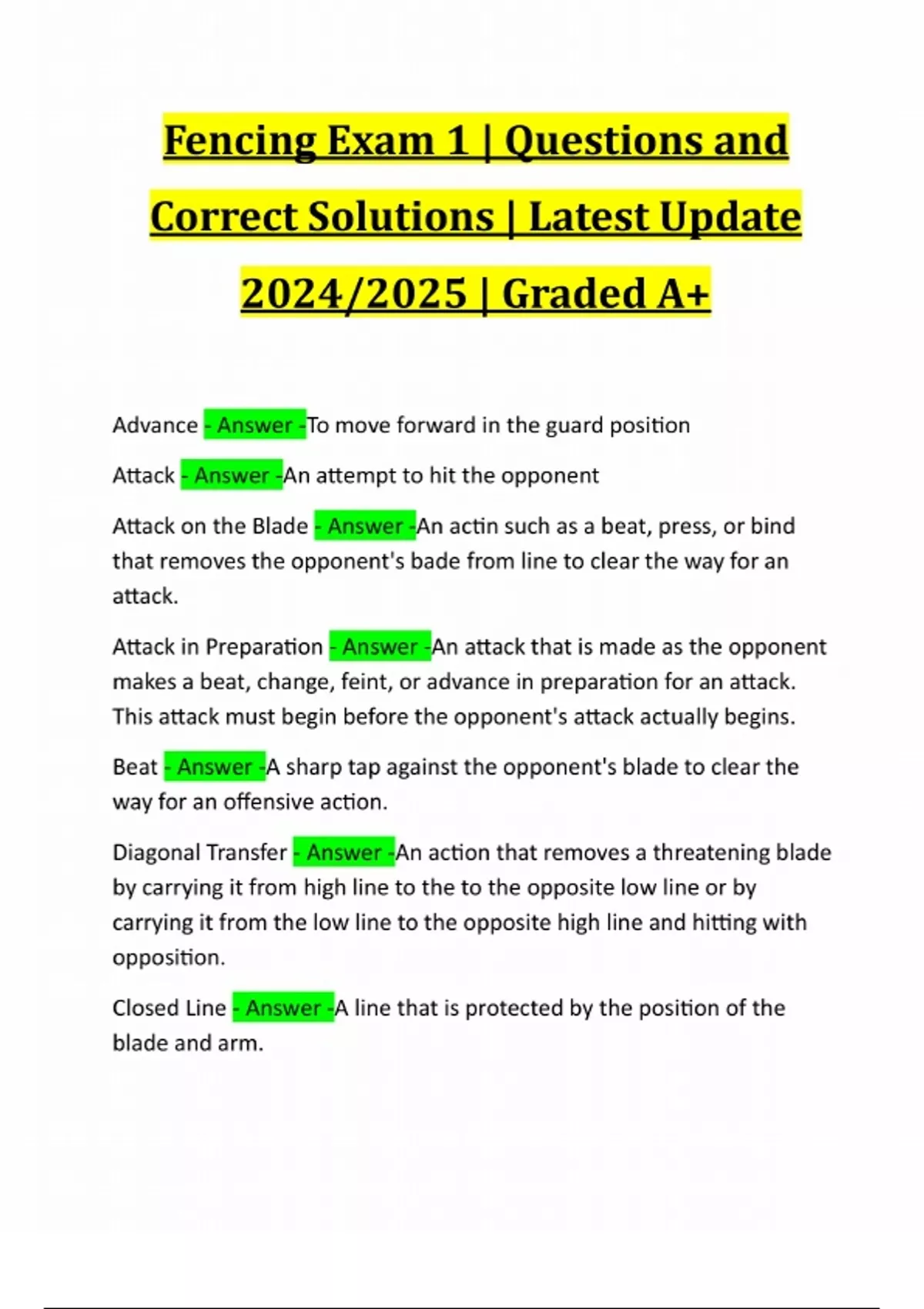 Fencing Exam 1 | Questions and Correct Solutions | Latest Update 2024/2025 | Graded A+ Advance - Answer -To move forward in the guard position Attack - Answer -An attempt to hit the opponent Attack on the Blade - Answer -An actin such as a beat, press, or bind that removes the opponent's bade from line to clear the way for an attack. Attack in Preparation - Answer -An attack that is made as the opponent makes a beat, change, feint, or advance in preparation for an attack. This attack must begin before the opponent's attack actually begins. Beat - Answer -A sharp tap against the opponent's blade to clear the way for an offensive action. Diagonal Transfer - Answer -An action that removes a threatening blade by carrying it from high line to the to the opposite low line or by carrying it from the low line to the opposite high line and hitting with opposition. Closed Line - Answer -A line that is protected by the position of the blade and arm.Compound Attack - Answer -Any attack consisting o