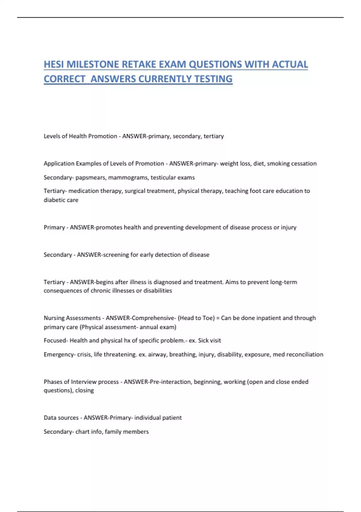 Primary - ANSWER-promotes health and preventing development of disease process or injury