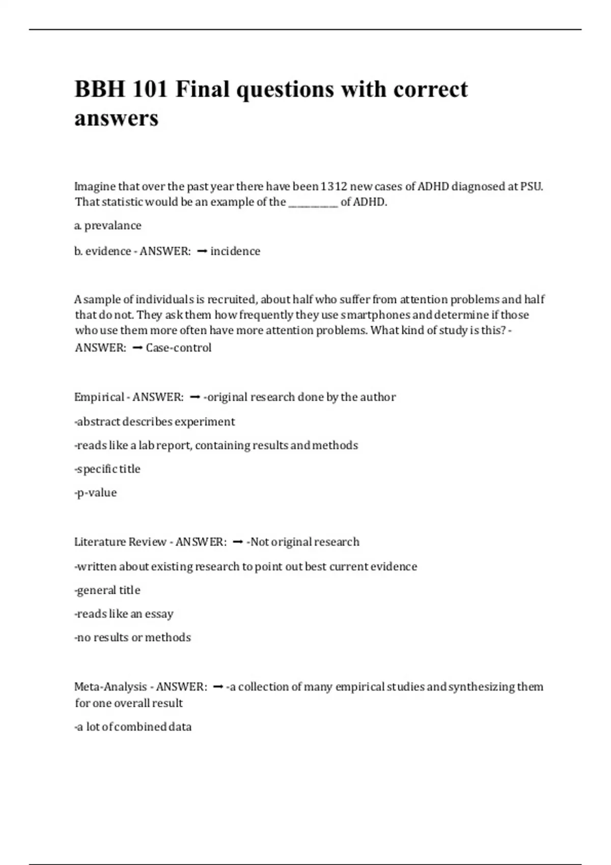 BBH 101 Final questions with correct