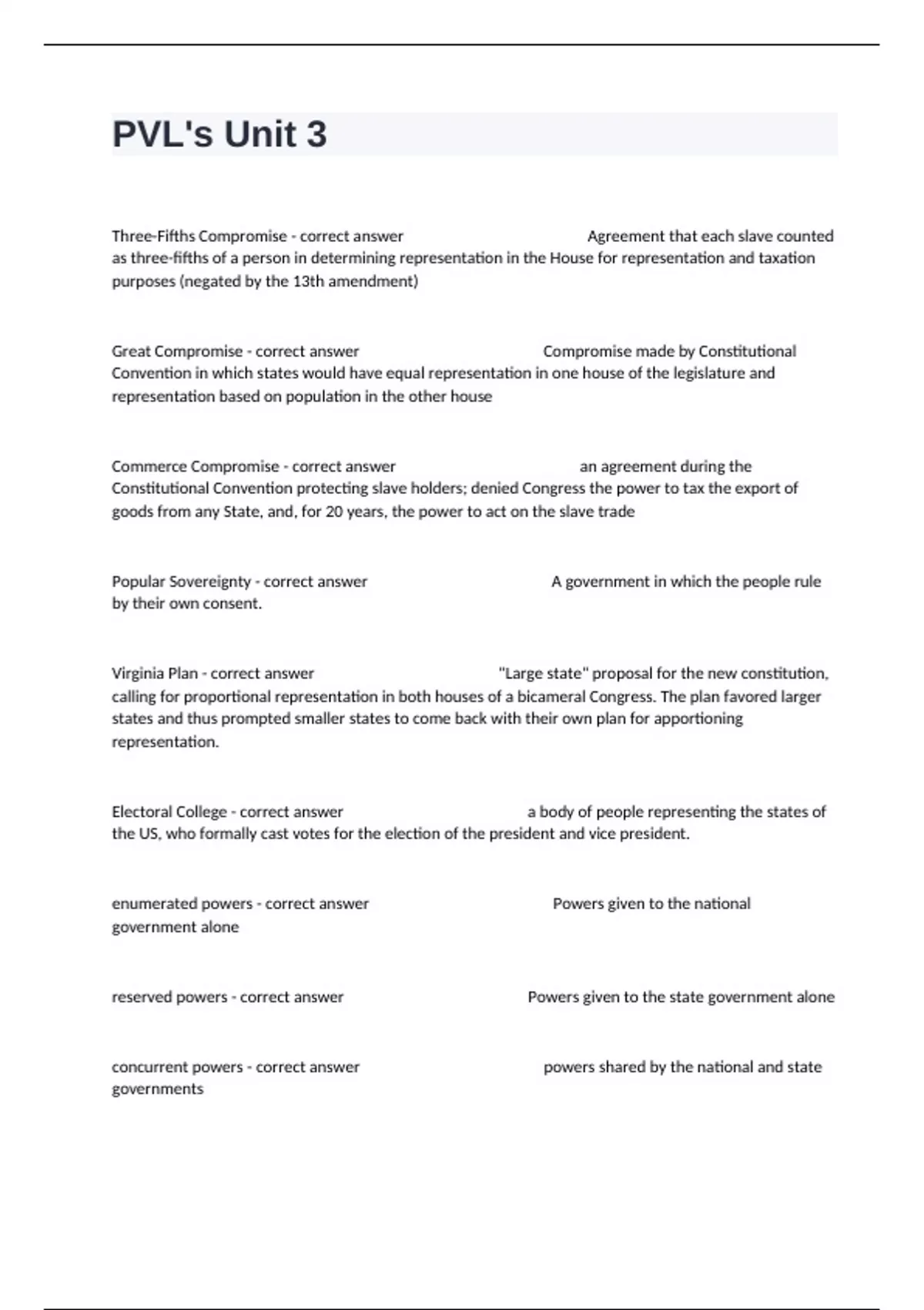 Three-Fifths Compromise - correct answer Agreement that each slave counted as three-fifths of a person in determining representation in the House for representation and taxation purposes (negated by the 13th amendment) Great Compromise - correct answer Compromise made by Constitutional Convention in which states would have equal representation in one house of the legislature and representation based on population in the other house Commerce Compromise - correct answer an agreement during the Constitutional Convention protecting slave holders; denied Congress the power to tax the export of goods from any State, and, for 20 years, the power to act on the slave trade Popular Sovereignty - correct answer A government in which the people rule by their own consent. Virginia Plan - correct answer "Large state" proposal for the new constitution, calling for proportional representation in both houses of a bicameral Congress. The plan favored larger states and thus prompted smaller states to come back with their own plan for apportioning representation. Electoral College - correct answer a body of people representing the states of the US, who formally cast votes for the election of the president and vice president. enumerated powers - correct answer Powers given to the national government alone reserved powers - correct answer Powers given to the state government alone concurrent powers - correct answer powers shared by the national and state governments Due Process - correct answer (law) the administration of justice according to established rules and principles Equal Protection - correct answer the equal application of the law regardless of a person's race, religion, political beliefs, or other qualities Naturalization - correct answer A legal process to obtain citizenship Amendment Process - correct answer the way in which changes are added to the Constitution double jeopardy - correct answer Anti-Federalist Papers - correct answer a series of essays written to counter and defeat the proposed U.S. Constitution Patrick Henry - correct answer a leader of the American Revolution and a famous orator who spoke out against British rule of the American colonies () George Mason - correct answer delegate who opposed the Constitution James Madison - correct answer "Father of the Constitution," Federalist leader, and fourth President of the United States. Article of Confederation - correct answer a document that outlined the first form of government in the United States of America Northwest Ordinance - correct answer a law passed by Congress in 1787 that specified how western lands would be governed Critical Period - correct answer Shay's Rebellion - correct answer Rebellion led by Daniel Shays of farmers in western Massachusetts in , protesting mortgage foreclosures. It highlighted the need for a strong national government just as the call for the Constitutional Convention went out. Constitutional Convention - correct answer A meeting in Philadelphia in 1787 that produced a new constitution Republicanism - correct answer A form of government in which people elect representatives to create and enforce laws Federalism - correct answer A system in which power is divided between the national and state governments Checks and Balances - correct answer A system that allows each branch of government to limit the powers of the other branches in order to prevent abuse of power Limited Government - correct answer The idea that certain restrictions should be placed on government to protect the natural rights of citizens. amendment - correct answer A change in, or addition to, a constitution or law Ratification - correct answer Formal approval Federalists - correct answer supporters of the Constitution Anit-Federalists - correct answer opposed the constitution Federalist Papers - correct answer