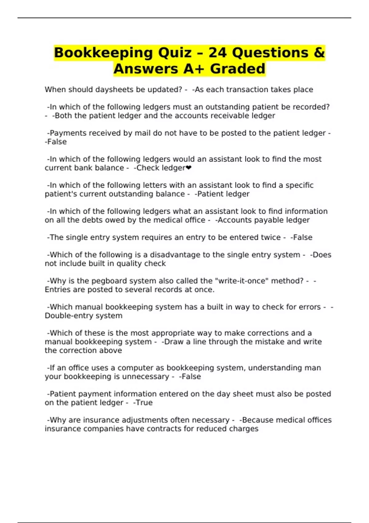 Bookkeeping Quiz – 24 Questions & Answers A+ Graded