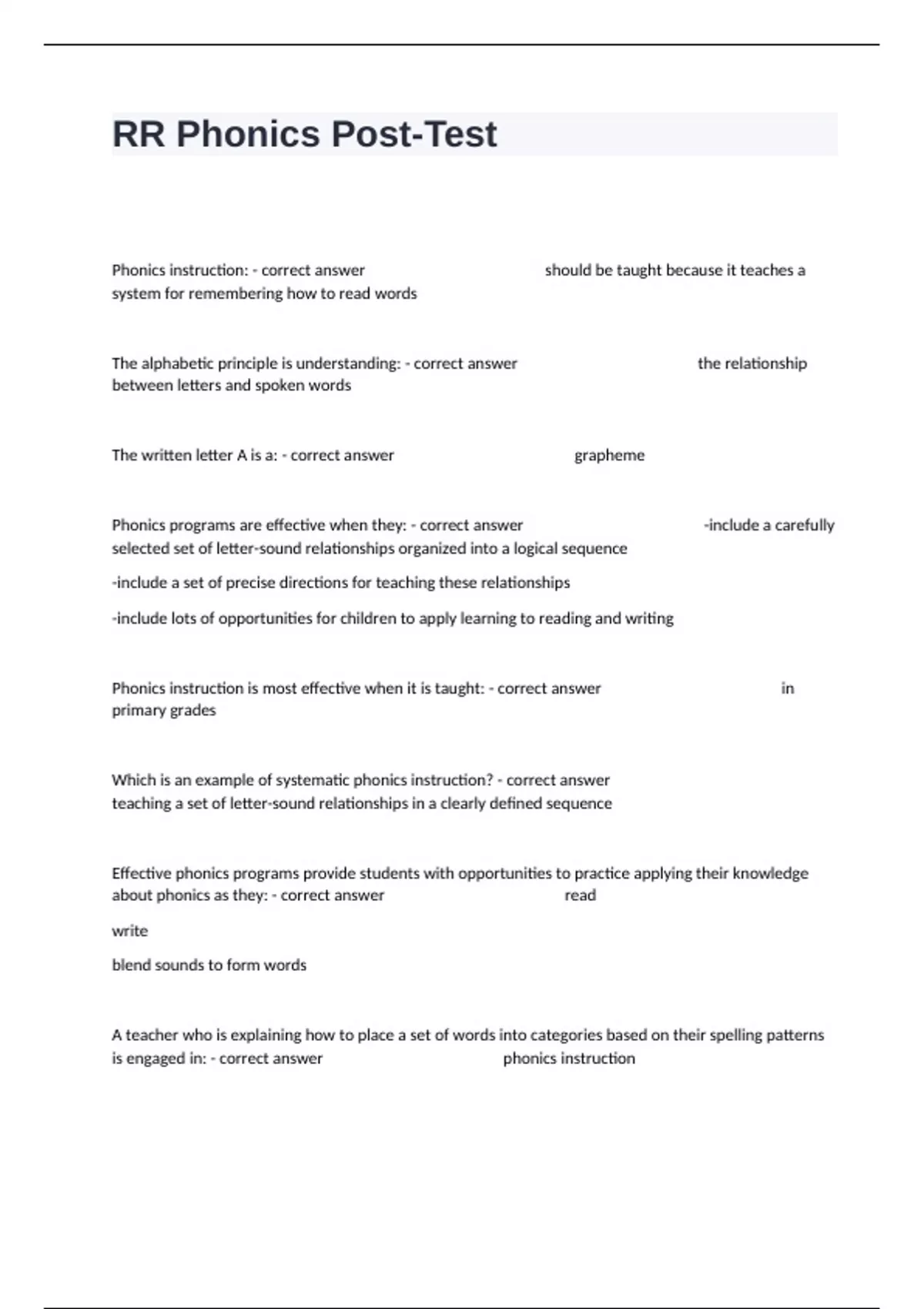 RR Phonics Post-Test Certification Exam Questions And Answers Verified Solutions.