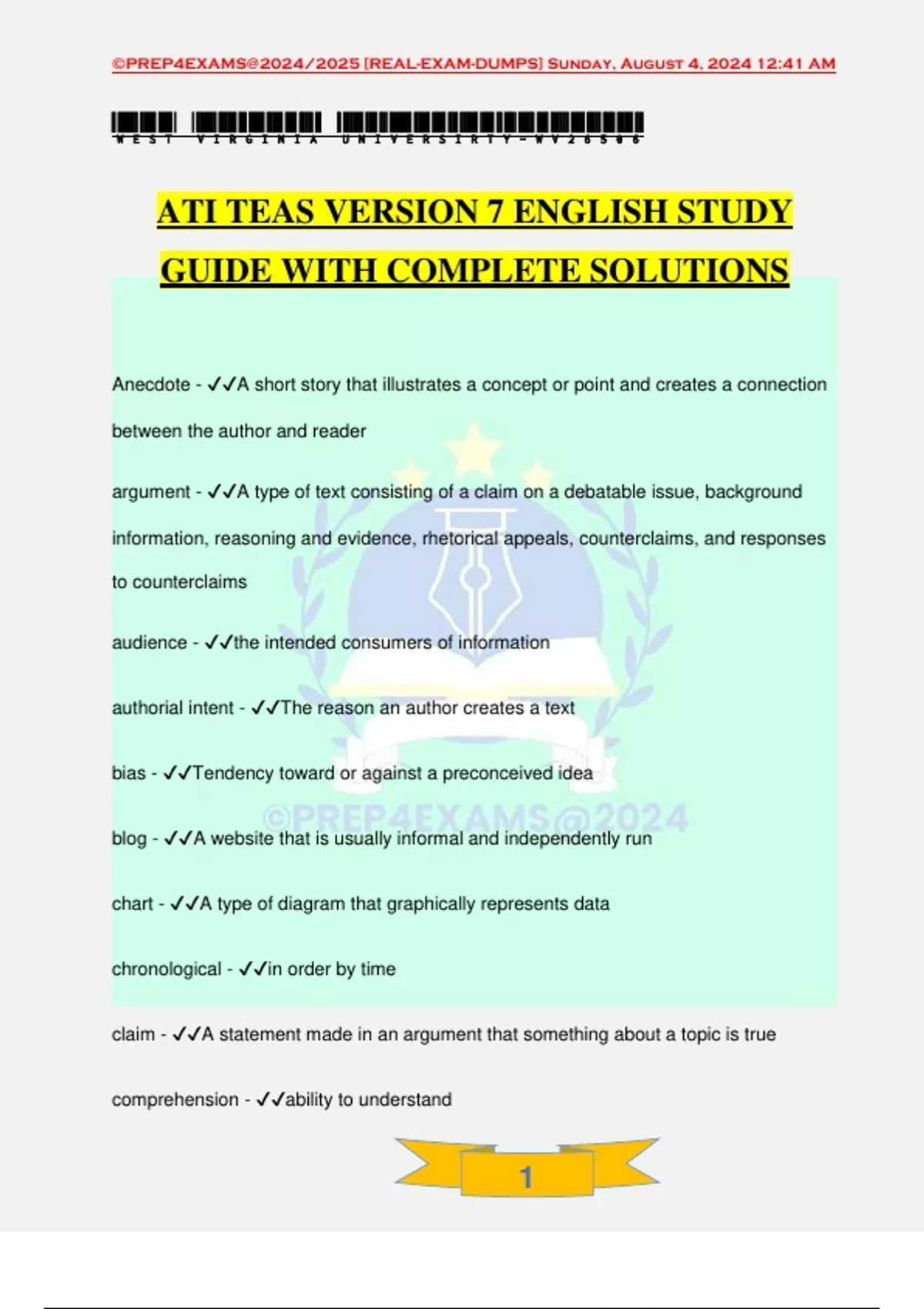 ATI TEAS VERSION 7 ENGLISH STUDY GUIDE WITH COMPLETE SOLUTIONS