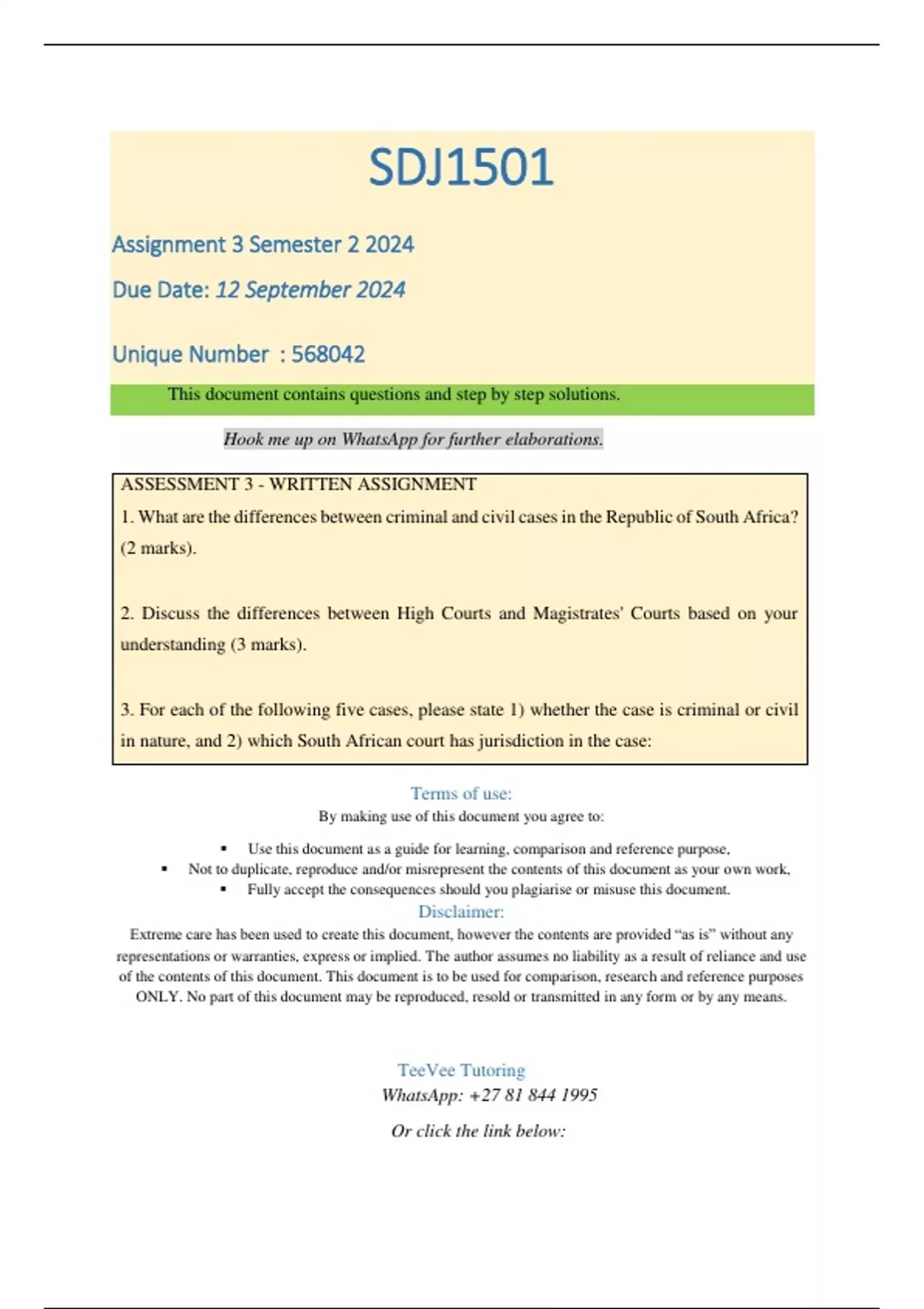 ASSESSMENT 3 - WRITTEN ASSIGNMENT 1. What are the differences between criminal and civil cases in the Republic of South Africa? (2 marks). 2. Discuss the differences between High Courts and Magistrates' Courts based on your understanding (3 marks). 3. For each of the following five cases, please state 1) whether the case is criminal or civil in nature, and 2) which South African court has jurisdiction in the case: 3.1 Obakeng, the founder of a social media network heads the unlawful operation of releasing the users' data to third party companies for profit. The users decided to sue the social media network company as a result of this. The claim was to the value of R850 000. 3.2 Anna has been married to Tom for 15 years and they have 3 children together. They decide to get a divorce as a result of Anna committing adultery. Tom issues summons and Anna disputes the settlement agreement. 3.3 Cindy attended a soccer match one day and met up with a classmate John after to have some lunch, John had too much to drink and attempted to sexually assault Cindy against her consent. 3.4 Neo got accepted into the chess team and Arnold did not, Arnold was jealous of Neo and punched him in the face outside the school property. 3.5 Jacob the father of baby Kekana, was not awarded custody over him. He fetched him after school and never returned him to his mother Lerato. Lerato called the police and reported Kekana missing. 4. Explain what a constitutional court is, and what types of cases it handles (3 Marks). 5. Discuss the purpose of the criminal justice system and how it ensures the prevention and control of crime to maintain public order (2 Marks).