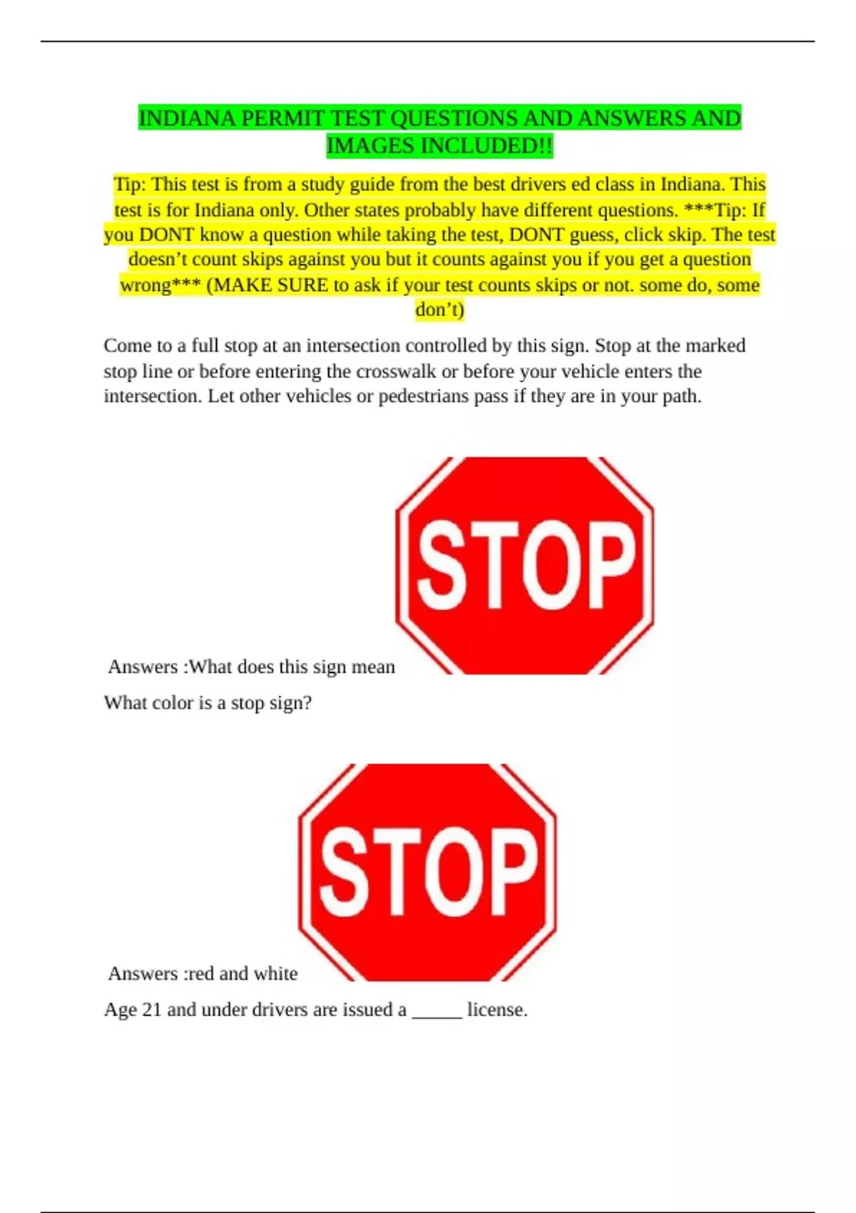 INDIANA PERMIT TEST QUESTIONS AND ANSWERS AND IMAGES INCLUDED!!