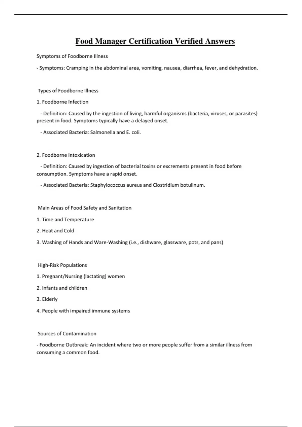 Main Areas of Food Safety and Sanitation