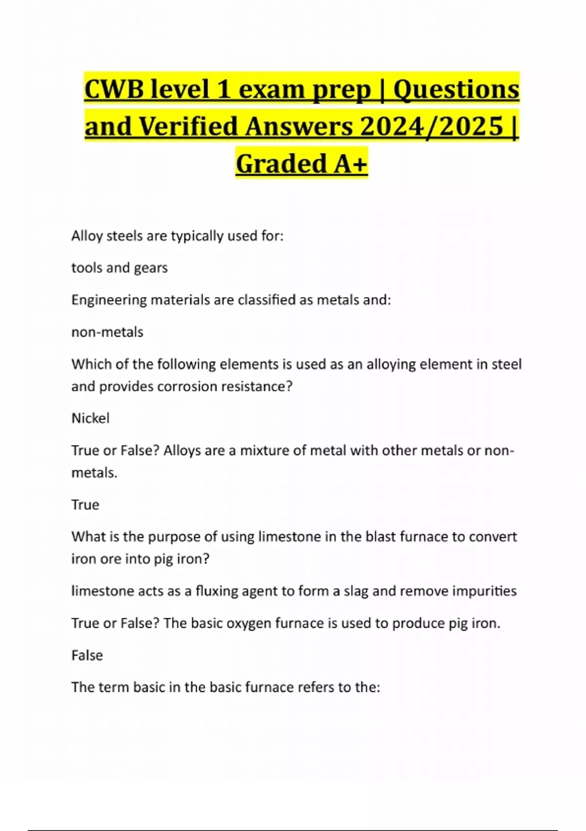 CWB level 1 exam prep | Questions and Verified Answers 2024/2025 | Graded A+ Alloy steels are typically used for: tools and gears Engineering materials are classified as metals and: non-metals Which of the following elements is used as an alloying element in steel and provides corrosion resistance? Nickel True or False? Alloys are a mixture of metal with other metals or nonmetals. True What is the purpose of using limestone in the blast furnace to convert iron ore into pig iron? limestone acts as a fluxing agent to form a slag and remove impurities True or False? The basic oxygen furnace is used to produce pig iron. False The term basic in the basic furnace refers to