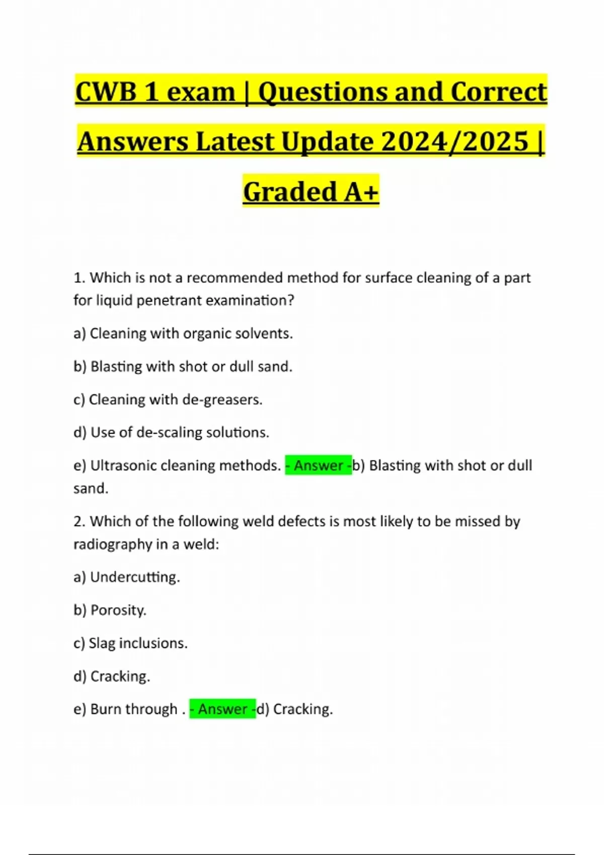 CWB 1 exam | Questions and Correct Answers Latest Update 2024/2025 | Graded A+ 1. Which is not a recommended method for surface cleaning of a part for liquid penetrant examination? a) Cleaning with organic solvents. b) Blasting with shot or dull sand. c) Cleaning with de-greasers. d) Use of de-scaling solutions. e) Ultrasonic cleaning methods. - Answer -b) Blasting with shot or dull sand. 2. Which of the following weld defects is most likely to be missed by radiography in a weld: a) Undercutting. b) Porosity. c) Slag inclusions. d) Cracking. e) Burn through . - Answer -d) Cracking.3. In the choices given below, metallographic tests would be the least informative with regard to the: a) Presence of the non-metallic inclusions. b) Grain structure in the weld and fusion zone. c) Ability of the material to withstand repeated fluctuating loads. d) Extent and structure of the heat affected zone. e) Number of weld passes. - A