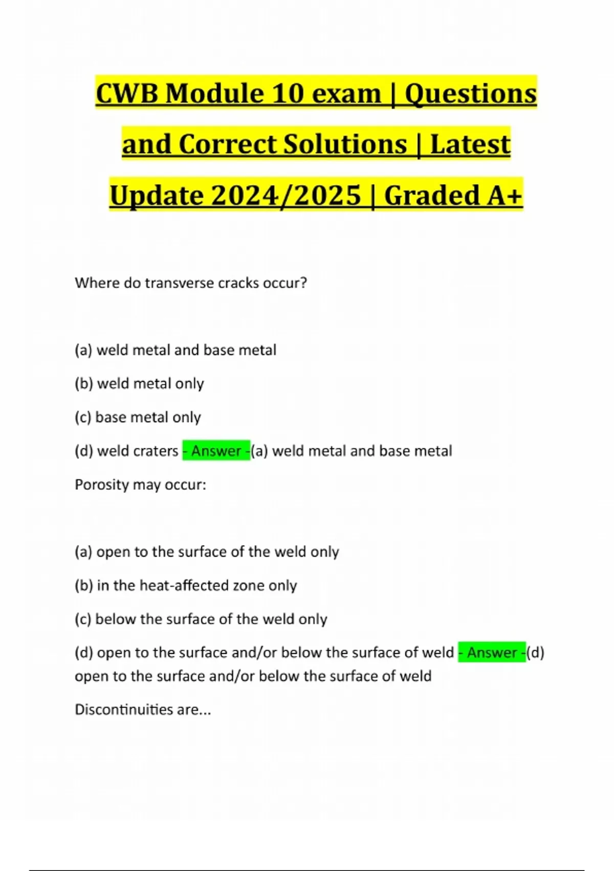 CWB Module 10 exam | Questions and Correct Solutions | Latest Update 2024/2025 | Graded A+ Where do transverse cracks occur? (a) weld metal and base metal (b) weld metal only (c) base metal only (d) weld craters - Answer -(a) weld metal and base metal Porosity may occur: (a) open to the surface of the weld only (b) in the heat-affected zone only (c) below the surface of the weld only (d) open to the surface and/or below the surface of weld - Answer -(d) open to the surface and/or below the surface of weld Discontinuities are...(a)