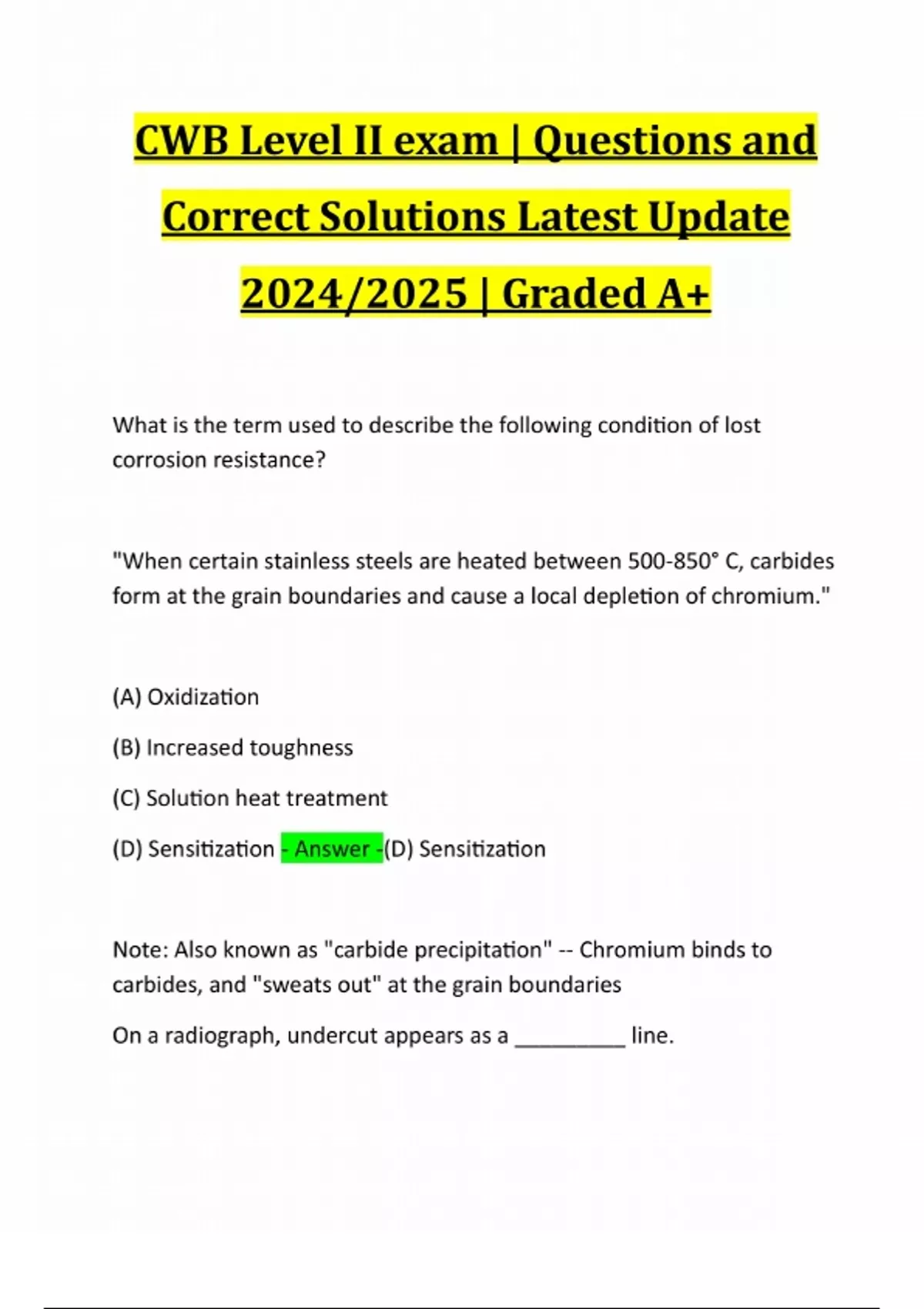 CWB Level II exam | Questions and Correct Solutions Latest Update 2024/2025 | Graded A+ What is the term used to describe the following condition of lost corrosion resistance? "When certain stainless steels are heated between 500-850° C, carbides form at the grain boundaries and cause a local depletion of chromium." (A) Oxidization (B) Increased toughness (C) Solution heat treatment (D) Sensitization - Answer -(D) Sensitization Note: Also known as "carbide precipitation" -- Chromium binds to carbides, and "sweats out" at the grain boundaries On a radiograph, undercut appears as a _________ line.(A) light (B) dark - Answer -(B) dark What is the Canadian Standard for safety in welding? - Answer -CSA W117.2 What is the typical three-phase input voltage in most Canadian welding shops? - Answer -600V True or False: The cable from the workpiece back to the welding machine is called the "ground lead". - Answer -False. The correct term is the "work lead". What is the type of radiation that can damage living cells? - Answer - Ionizing Name two examples of ionizing radiation. - Answer -X-rays and Gamma rays