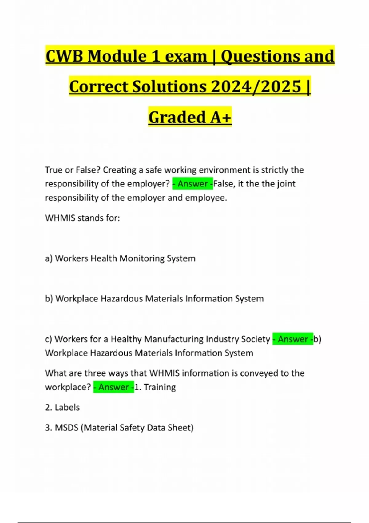 CWB Module 1 exam | Questions and Correct Solutions 2024/2025 | Graded A+ True or False? Creating a safe working environment is strictly the responsibility of the employer? - Answer -False, it the the joint responsibility of the employer and employee. WHMIS stands for: a) Workers Health Monitoring System b) Workplace Hazardous Materials Information System c) Workers for a Healthy Manufacturing Industry Society - Answer -b) Workplace Hazardous Materials Information System What are three ways that WHMIS information is conveyed to the workplace? - Answer -1. Training 2. Labels 3. MSDS (Material Safety Data Sheet)If you wish to find out the hazardous ingredients of a product and their toxicological properties, where would you look? - Answer -MSDS (Material Safety Data Sheet) Is there a Canadian Standard for safety in welding? - Answer -Yes, CSA W117.2 What is the typical three-phase input voltage to welding machines in most shops? - Answer -USA: 480V CA: 600V True or False? The voltage on the secondary side of welding machines is always so low there can never be a danger of electric shocks? - Answer - False Why is it possible to still get an electric shock by touching only one w