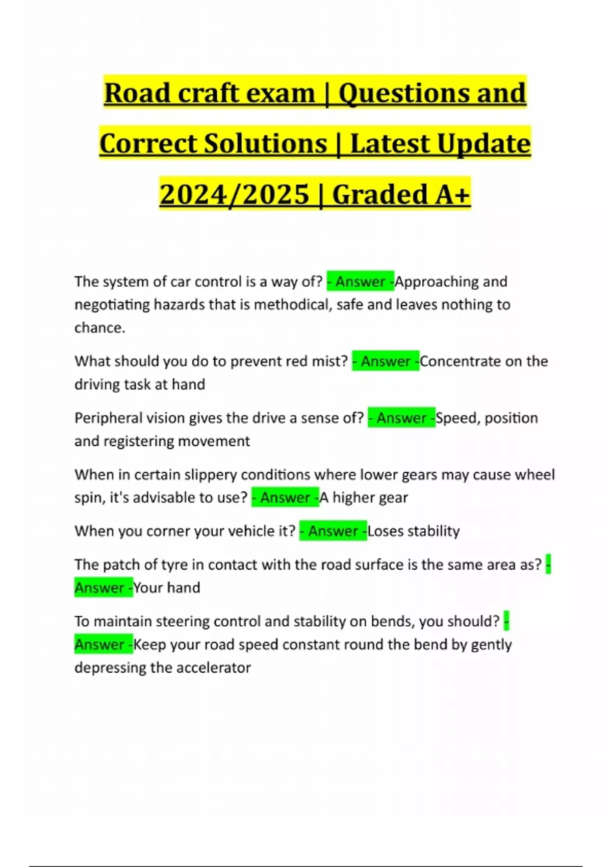 Road craft exam | Questions and Correct Solutions | Latest Update 2024/2025 | Graded A+