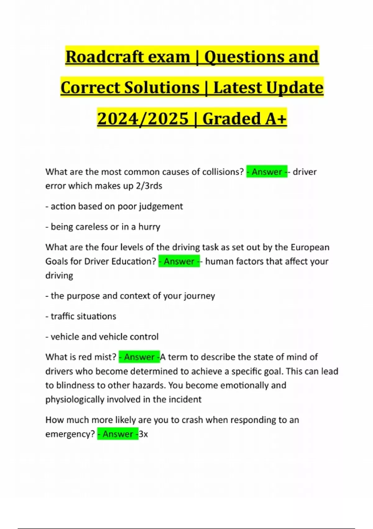 Roadcraft exam | Questions and Correct Solutions | Latest Update 2024/2025 | Graded A+ What are the most common causes of collisions? - Answer -- driver error which makes up 2/3rds - action based on poor judgement - being careless or in a hurry What are the four levels of the driving task as set out by the European Goals for Driver Education? - Answer -- human factors that affect your driving - the purpose and context of your journey - traffic situations - vehicle and vehicle control What is red mist? - Answer -A term to describe the state of mind of drivers who become determined to achieve a specific goal. This can lead to blindness to other hazards. You become emotionally and physiologically involved in the incident How much more likely are you to crash when responding to an emergency? - Answer -3xWhat human factors may be a risk when driving? - Answer -impulsive personality operational stress