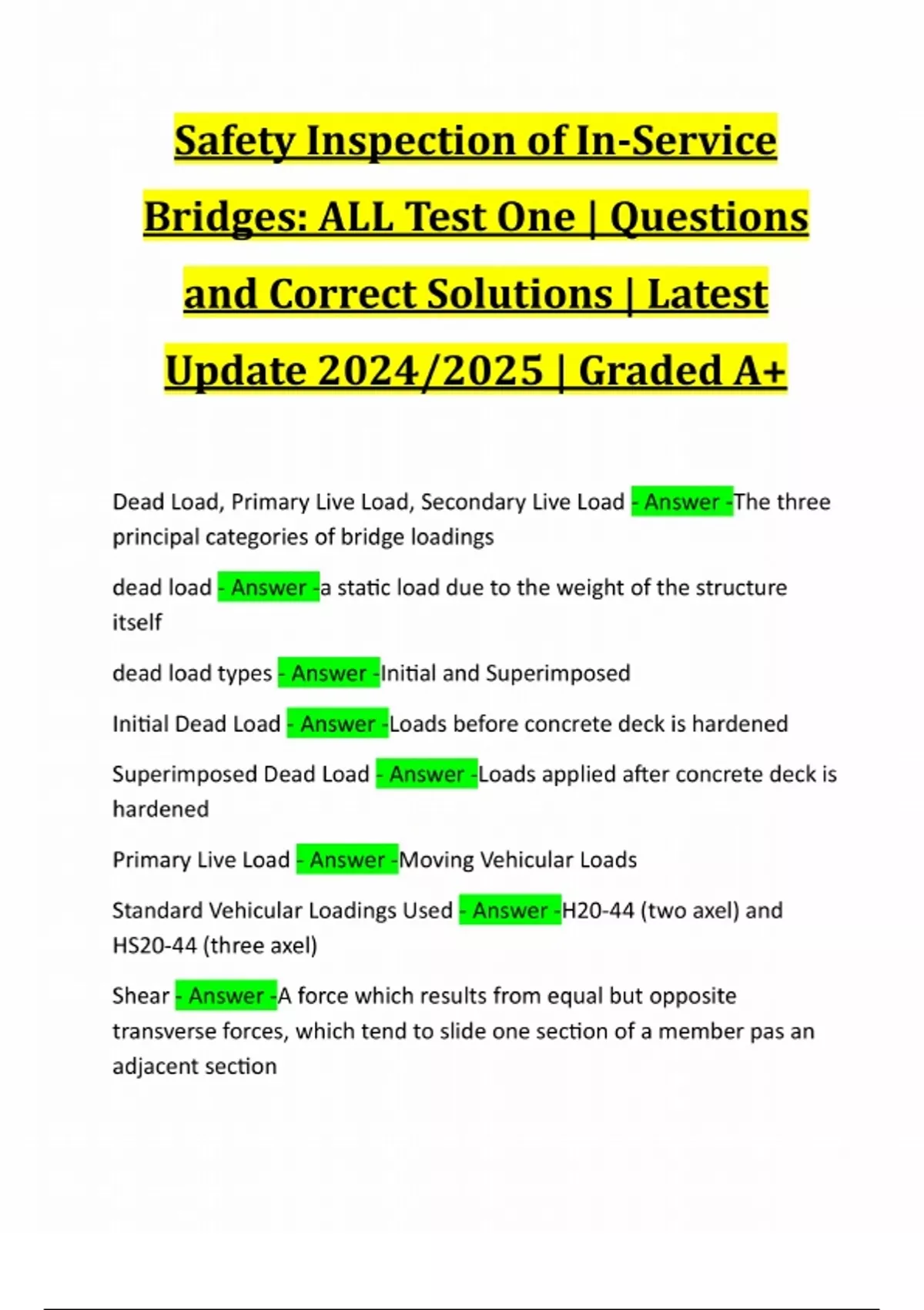 Safety Inspection of In-Service Bridges: ALL Test One | Questions and Correct Solutions | Latest Update 2024/2025 | Graded A+ Dead Load, Primary Live Load, Secondary Live Load - Answer -The three principal categories of bridge loadings dead load - Answer -a static load due to the weight of the structure itself dead load types - Answer -Initial and Superimposed Initial Dead Load - Answer -Loads before concrete deck is hardened Superimposed Dead Load - Answer -Loads applied after concrete deck is hardened Primary Live Load - Answer -Moving Vehicular Loads Standard Vehicular Loadings Used - Answer -H20-44 (two axel) and HS20-44 (three axel) Shear - Answer -A force which results from equal but opposite transverse forces, which tend to slide one section of a member pas an adjacent sectionAxial Force - Answer -A force that is a push or pull type force which acts in the long direction of the member. Torsion - Answer -A force resulting from an external moment, which tends to rotate or twist a member about its longitudinal axis Moment - Answer -A force developed when an external load applied transversely to a bridge member causes its t