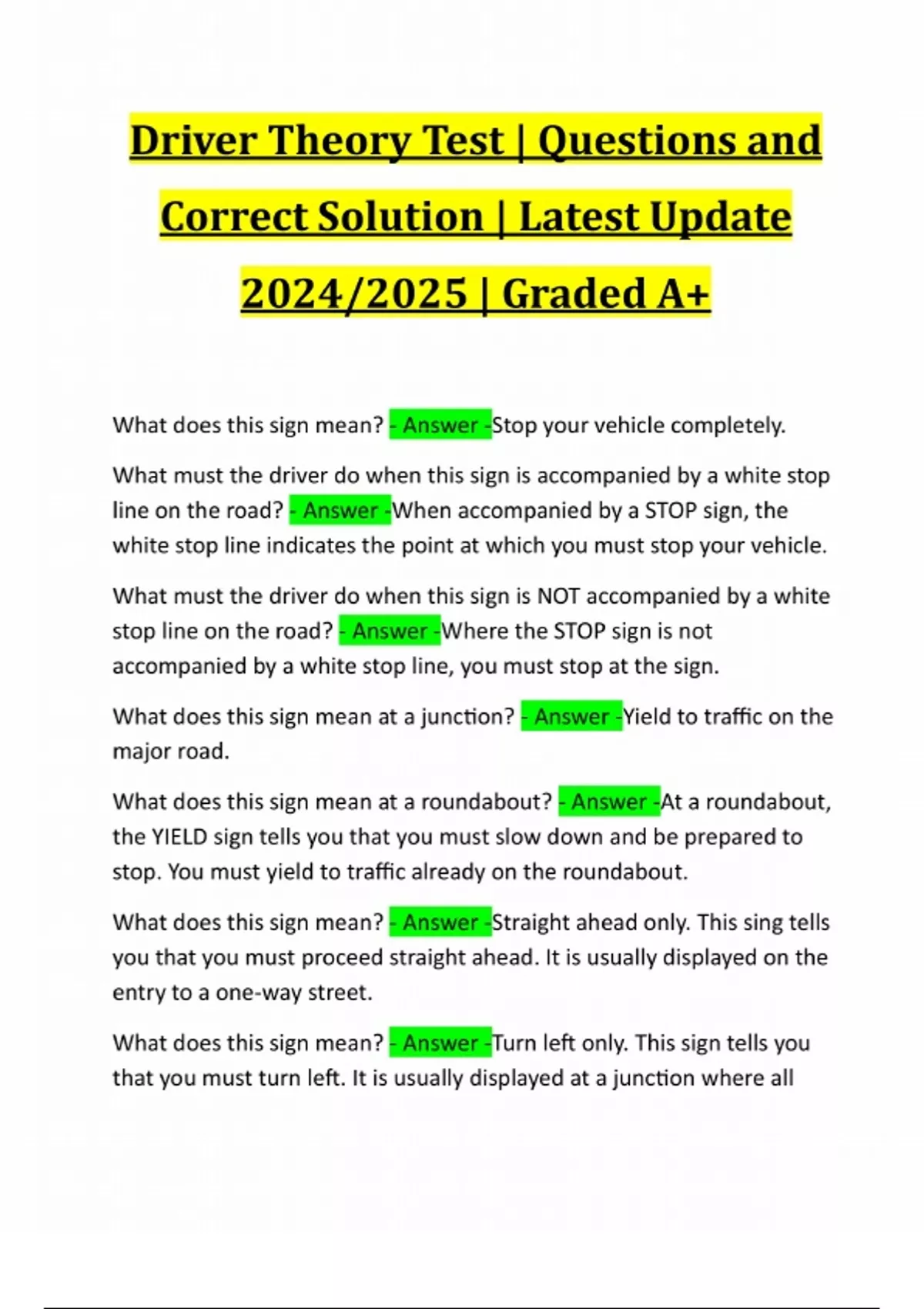 Driver Theory Test | Questions and Correct Solution | Latest Update 2024/2025 | Graded A+ What does this sign mean? - Answer -Stop your vehicle completely. What must the driver do when this sign is accompanied by a white stop line on the road? - Answer -When accompanied by a STOP sign, the white stop line indicates the point at which you must stop your vehicle. What must the driver do when this sign is NOT accompanied by a white stop line on the road? - Answer -Where the STOP sign is not accompanied by a white stop line, you must stop at the sign. What does this sign mean at a junction? - Answer -Yield to traffic on the major road. What does this sign mean at a roundabout? - Answer -At a roundabout, the YIELD sign tells you that you must slow down and be prepared to stop. You must yield to traffic already on the roundabout. What does this sign mean? - Answer -Straight ahead only. This sing tells you that you must proceed straight ahea