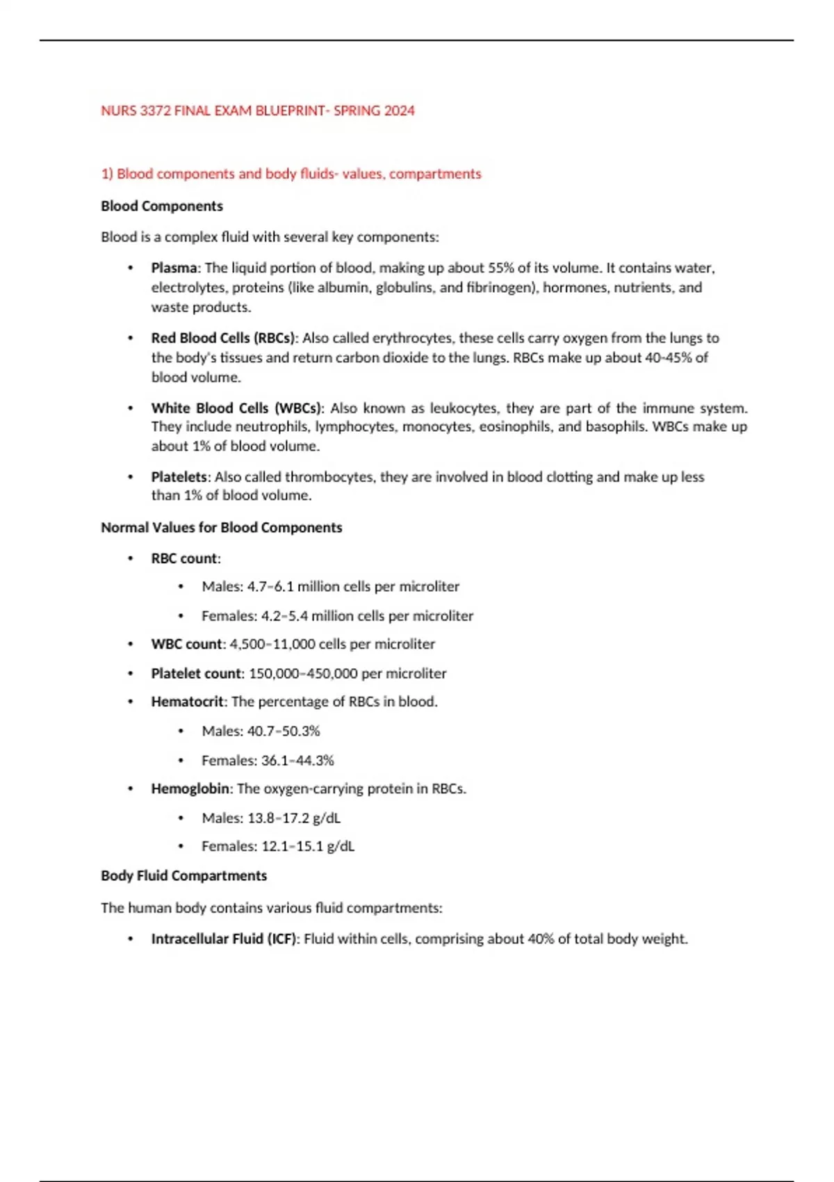 1) Blood components and body fluids- values, compartments
