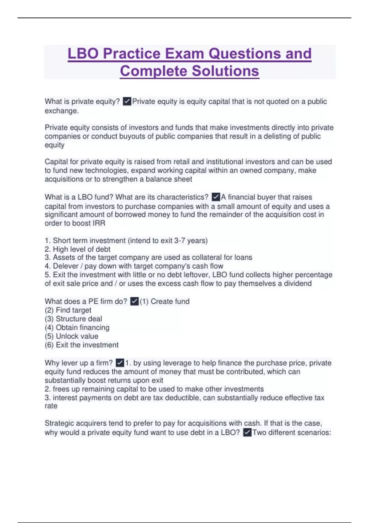 LBO Practice Exam Questions and Complete Solutions